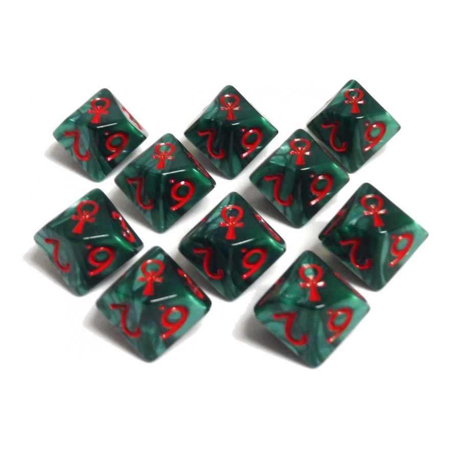 Set di 10 dadi a 10 facce verde perlati con numeri in rosso e design ispirato ai Vampiri con il simbolo dell’Ankh al posto del numero 1.