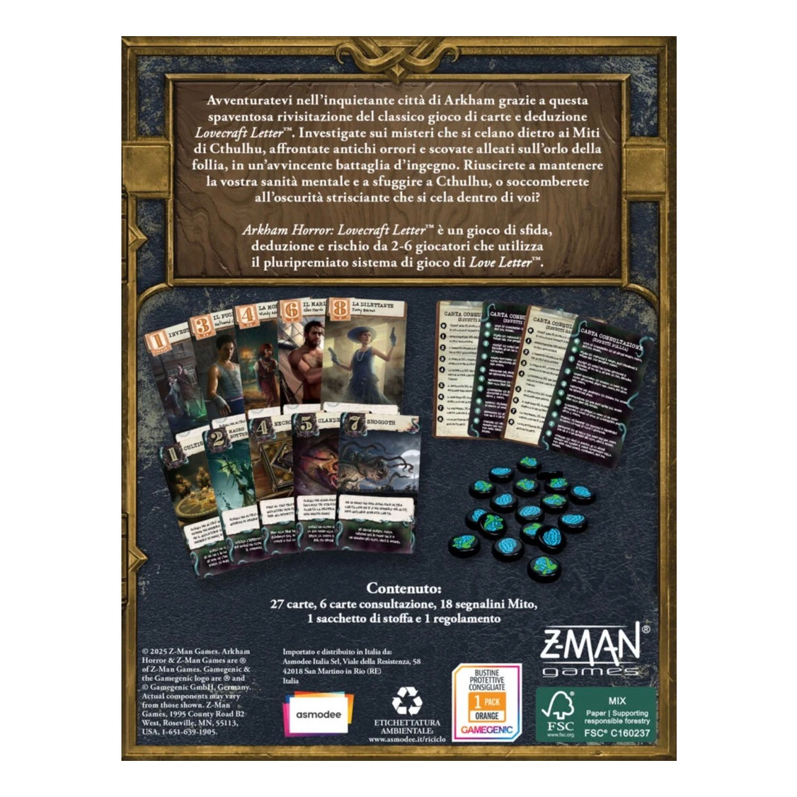 Avventuratevi nell’inquietante città d di Arkham grazie a questa spaventosa rivisitazione del classico gioco di carte e deduzione Lovecraft Letter™. Investigate sui misteri che si celano dietro ai Miti di Cthulhu, affrontate antichi orrori e scovate alleati sull’orlo della follia, in un’avvincente battaglia d’ingegno. Riuscirete a mantenere la vostra sanità mentale e a sfuggire a Cthulhu, o soccomberete all’oscurità strisciante che si cela dentro di voi?