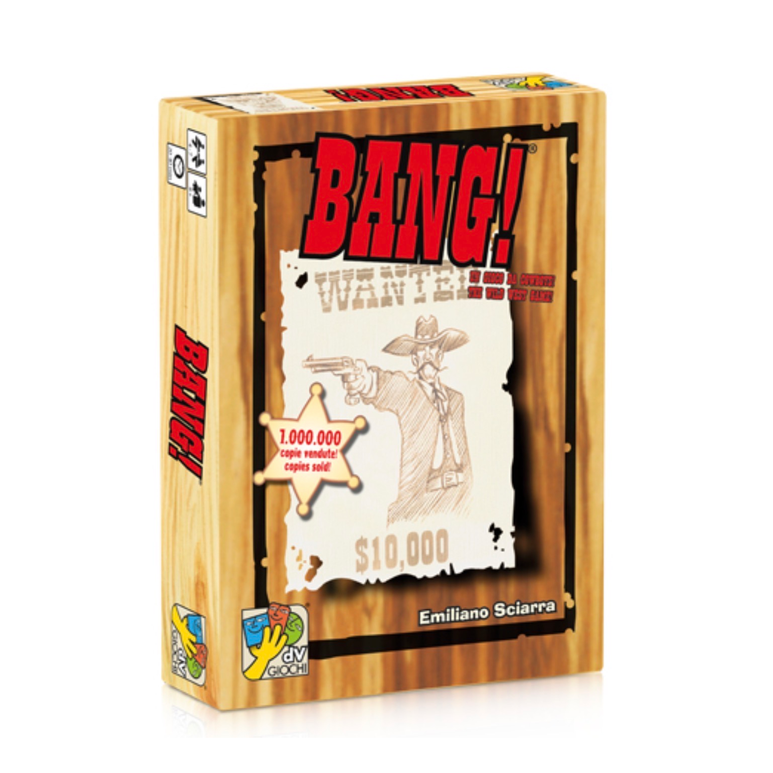 Quando l’uomo col Winchester incontra l’uomo con la pistola, l’uomo con la pistola è un uomo morto… a meno che non abbia una Volcanic!I Fuorilegge danno la caccia allo Sceriffo. Lo Sceriffo dà la caccia ai Fuorilegge. Il Rinnegato trama nell’ombra, pronto a schierarsi da una parte o dall’altra. Le pallottole volano. Chi fra i pistoleri sarà un aiutante dello Sceriffo, pronto a sacrificarsi per lui? E chi invece uno spietato Fuorilegge, che non aspetta altro che farlo fuori?Il gioco western più venduto del mondo, oggi in una versione ancora più ricca e facile da imparare!Bang! è un gioco di sparatorie, in puro stile “Spaghetti Western”, fra un gruppo di Fuorilegge e lo Sceriffo, che è l’obiettivo primario dei banditi. Lo Sceriffo è aiutato dai suoi Vice in incognito, ma c’è anche un Rinnegato che persegue i suoi scopi! In Bang! ogni giocatore ha uno di questi ruoli, e interpreta un personaggio ispirato alle più famose celebrità del West!