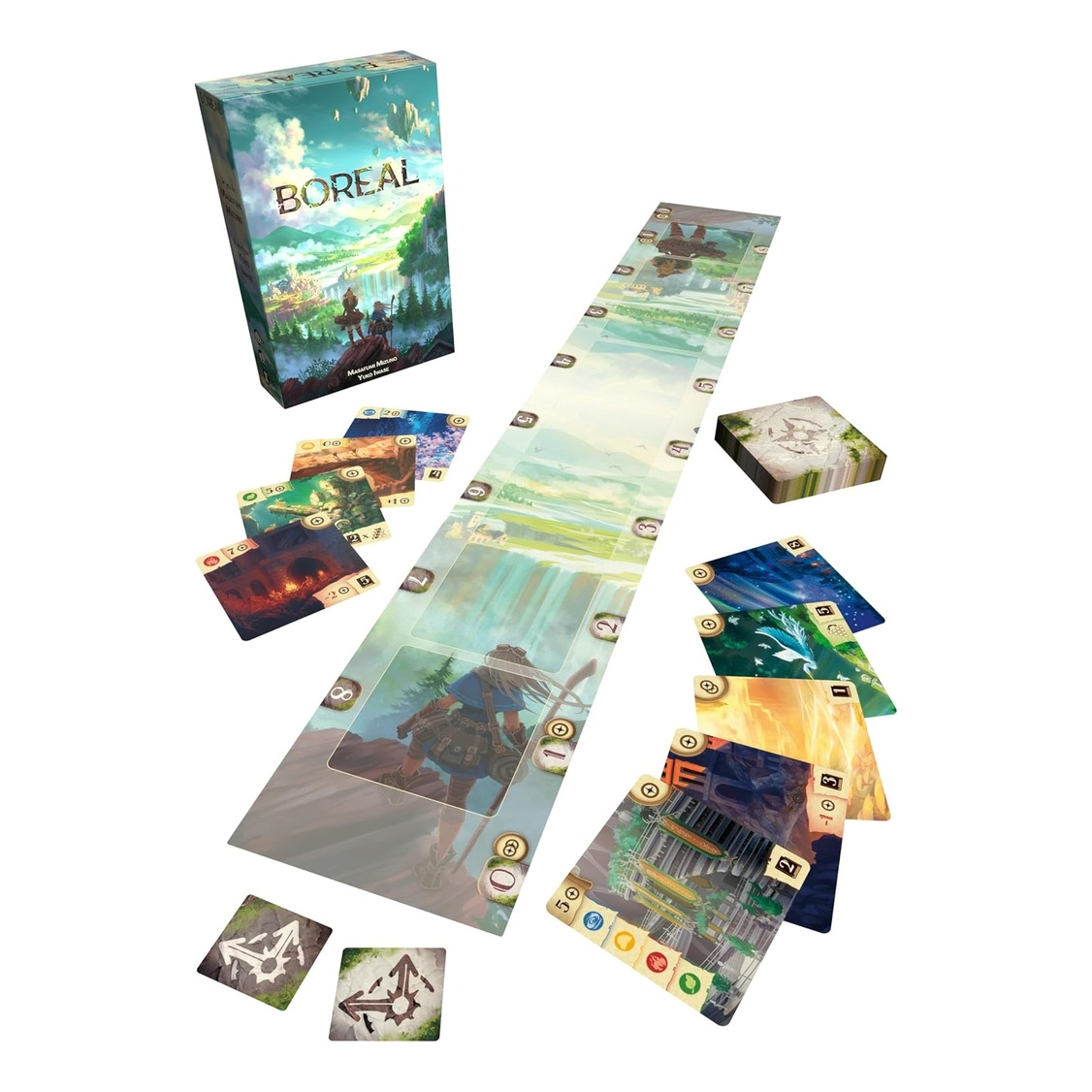 In Boreal, i giocatori costruiscono uno schieramento di carte, ognuna rappresentante un luogo da esplorare. Muovendo i segnalini sul tabellone, i giocatori devono gestire strategicamente le bussole per cercare di ottenere le carte rovine che portano conoscenze. Il gioco include 44 carte che offrono un’enorme varietà strategica.
