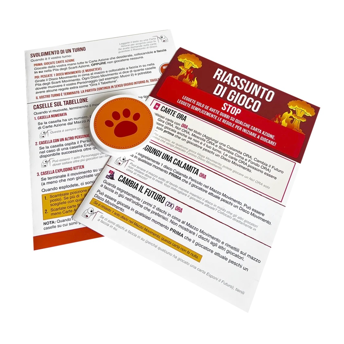 Come si vince? Arrivando per primi alla fine del percorso! Semplice no? NO! Perché il percorso è tempestato da bombe (Exploding Kittens) e ogni volta che esploderemo senza avere con noi un Disinnesgatto, saremo costretti a indietreggiare, allontanandoci sempre più dalla vittoria.