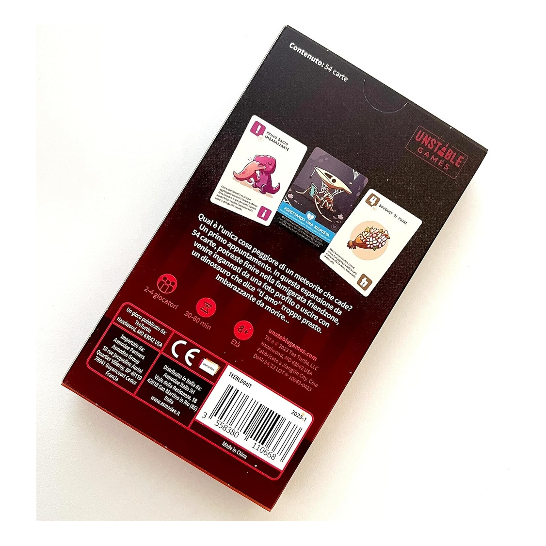 Qual è l’unica cosa peggiore di un meteorite che cade? Un primo appuntamento. In questa espansione da 54 carte, potreste finire nella famigerata friendzone, venire ingannati da una foto profilo o uscire con un dinosauro che dice “ti amo” troppo presto. Imbarazzante da morire…