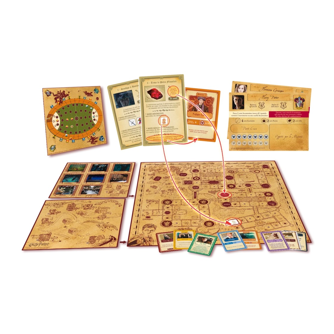Scegliete il vostro personaggio e ricevete 5 carte missione da completare. Avrete tre tabelloni in cui muovervi, tramite i dadi: Hogwarts, Diagon Alleye il campo di Quidditch (dove potrete sfidare gli avversari a duello!). A seconda dei luoghi che attraversate, raccogliete gli oggetti necessari per le vostre missioni. Ma state attenti! I Mangiamorte si nascondono nella mappa e sono pronti ad attaccarvi! E non solo, anche gli incontri con altri giocatori genereranno dei combattimenti. Se sarete in grado, con gli oggetti richiesti, di arrivare nei luoghi indicati, completando più missioni e ottenendo tutti i punti necessari, allora la vittoria sarà vostra! Diversi livelli di difficoltà disponibili!