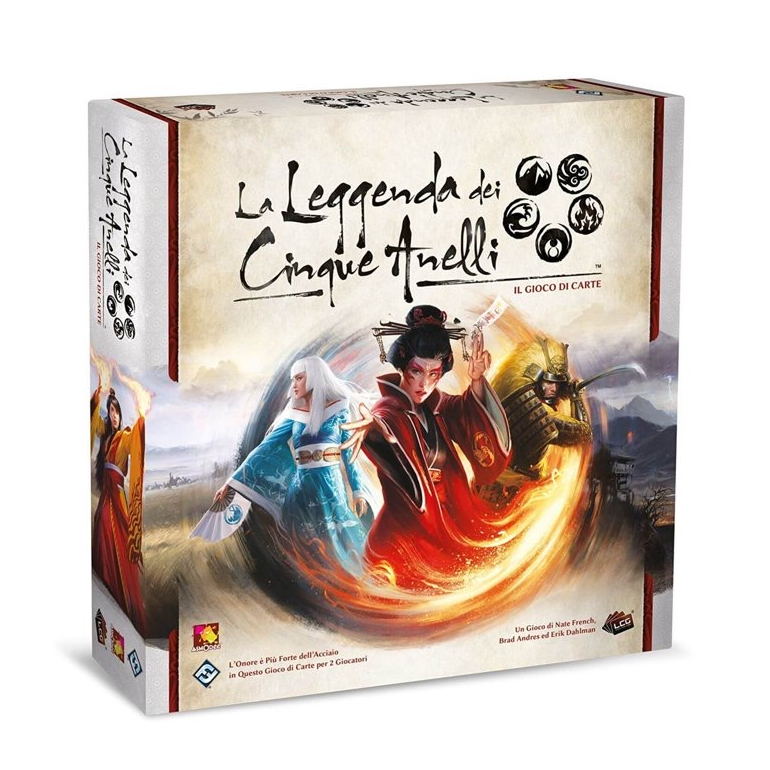 La Leggenda dei Cinque Anelli: Il Gioco di Carte è un Living Card Game (LCG) che vi condurrà nell’Impero di Rokugan, una delle ambientazioni fantasy a tema orientale più longeve e affascinanti di sempre! Nei panni di un comandante di uno dei 7 clan del reame (Scorpione, Gru, Unicorno, Leone, Dragone, Granchio e Fenice) dovrete combattere per impressionare l’Imperatore ed ottenerne il beneficio, arrecando grande onore al vostro clan.Le vostre schermaglie avranno luogo nelle varie province dell’impero, consentendovi di far mostra delle abilità diplomatiche e di combattimento dei vostri seguaci. Ogni sfida che deciderà l’esito dello scontro avrà in palio uno dei potentissimi Cinque Anelli di Rokugan, ciascuno legato ad uno dei 5 elementi (Aria, Acqua, Terra, Fuoco e Vuoto) e ciascuno con un potere in grado di cambiare le sorti della battaglia. Chi riuscirà a sconfiggere l’avversario assaltando il suo quartier generale, oppure ottenendo l’onore necessario per vincere la partita?La Leggenda dei Cinque Anelli è una rivisitazione dell’omonimo gioco di carte collezionabile, rivisto ed adattato al celebre formato LCG. Le meccaniche di gioco attingono da un background assolutamente originale, ricco di elementi proveniente sia dal mondo dei giochi da tavolo che da quello dei giochi di carte collezionabili. Ogni scelta di gioco risulta rilevante, sia nella fase di composizione del mazzo, che durante il gioco, quando sarà necessario capire quale seguace giocare, per quanto tempo schierarlo e dal come impiegarlo. Rokugan è impero colmo di intrighi a corte e battaglie epiche, dove la vita di un grande uomo viene decisa dalle sue gesta, prima che dal suo nome. Riuscirete a scrivere il vostro nome nella galleria degli eroi del vostro clan e diventare così un Hatamoto? La leggenda vi attende.