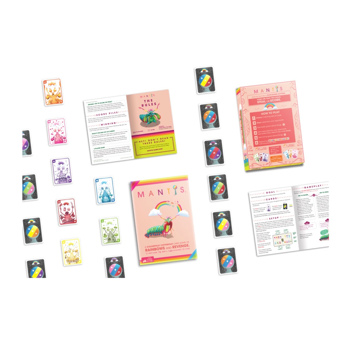 Uno spietato e colorato gioco di carte a base di arcobaleni e vendette. Ci sono solo due azioni disponibili: Rubare o Fare Punti. Con la sua semplicità e scorrevolezza di gioco, Mantis è pensato sia per i bambini che per gli adulti.