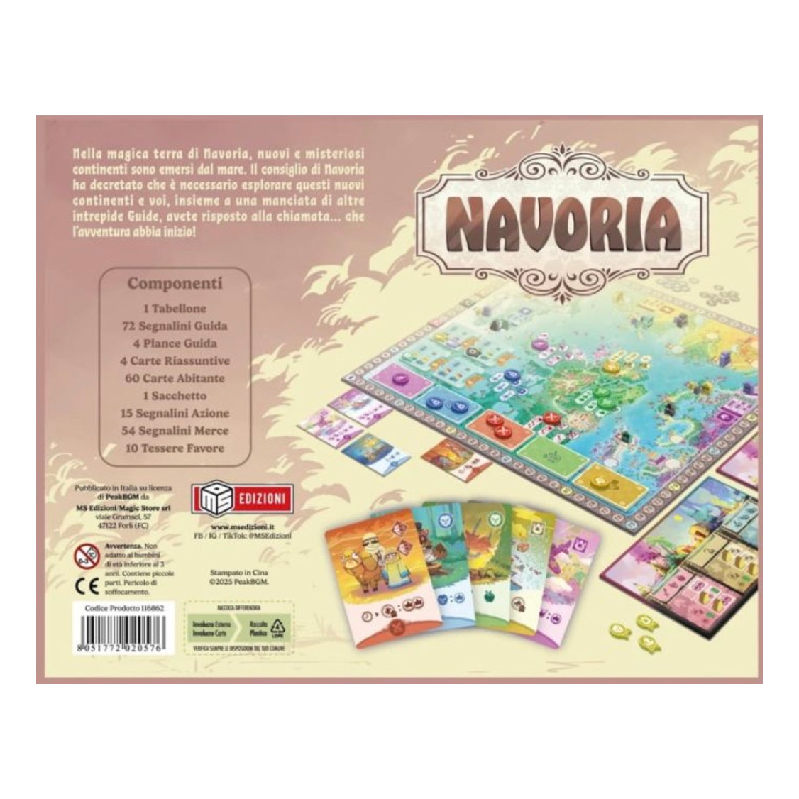 In Navoria ogni persona al tavolo assume il ruolo di un esploratore che cerca di reclutare abitanti per esplorare, per scoprire tesori e per raccogliere merci.