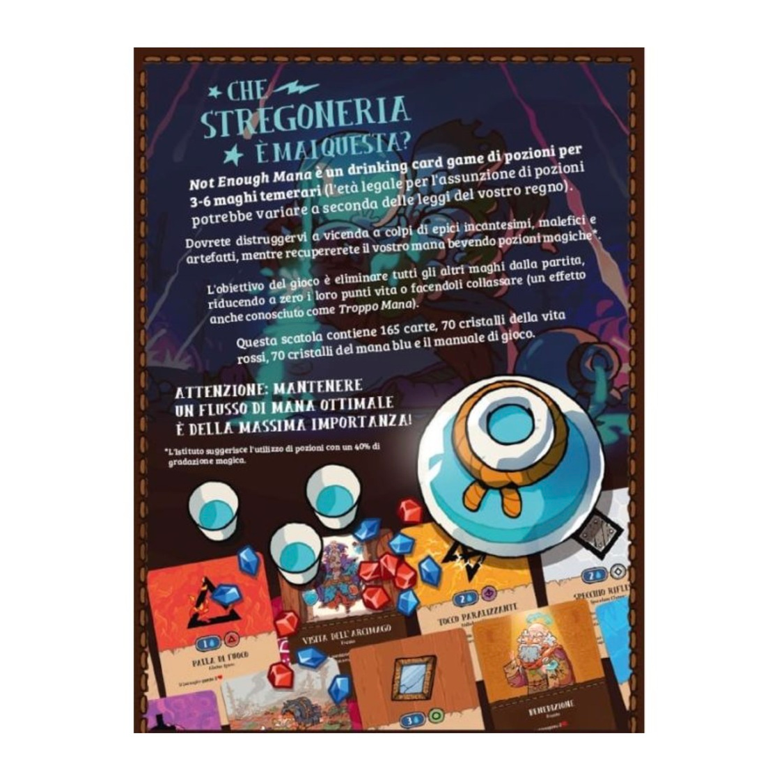 In Not Enough Mana, l’obiettivo è semplice: eliminare tutti gli altri maghi dalla partita. Ogni giocatore inizia con un set di carte che rappresentano incantesimi, malefici e artefatti. Per lanciare questi incantesimi, i maghi devono utilizzare il loro mana, che si recupera bevendo le pozioni “magiche”. Il gioco termina quando un mago riesce a ridurre a zero i punti vita degli avversari o li fa collassare, un effetto noto come Troppo Mana. La scatola di Not Enough Mana include 165 carte, 70 cristalli della vita rossi, 70 cristalli del mana blu e un manuale di gioco dettagliato per guidarti nelle tue avventure.
