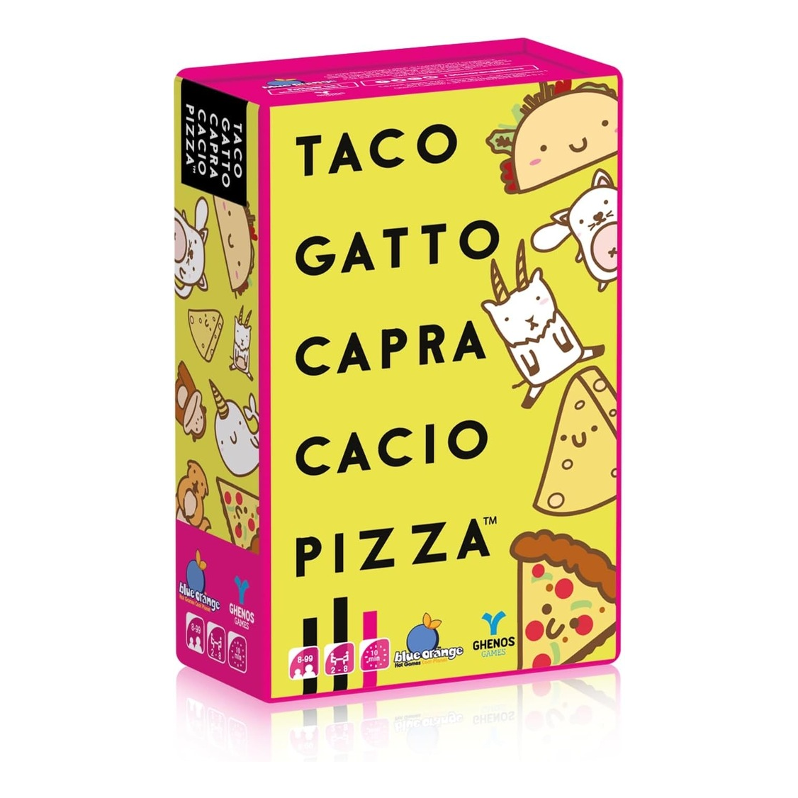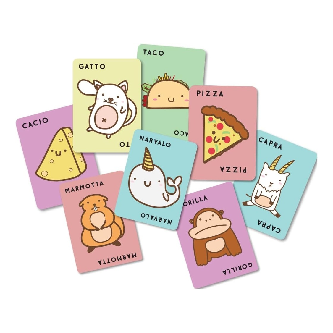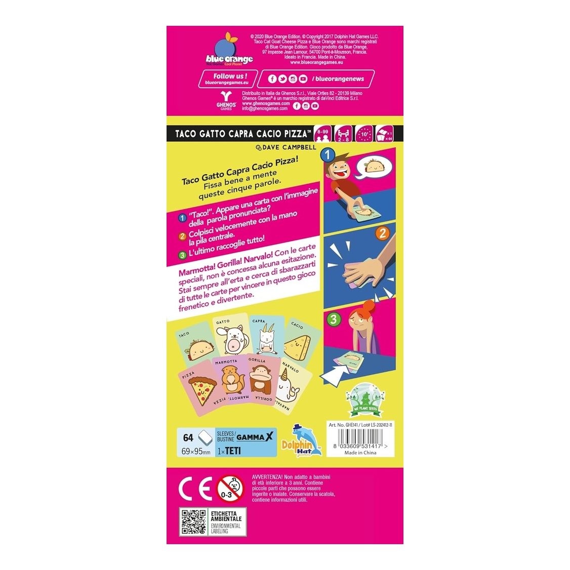 Taco Gatto Capra Cacio Pizza! Fissate bene a mente queste 5 parole. Appare una carta con l’immagine della parola dichiarata? Colpite con la mano velocemente la pila centrale. L’ultimo raccoglie tutto!