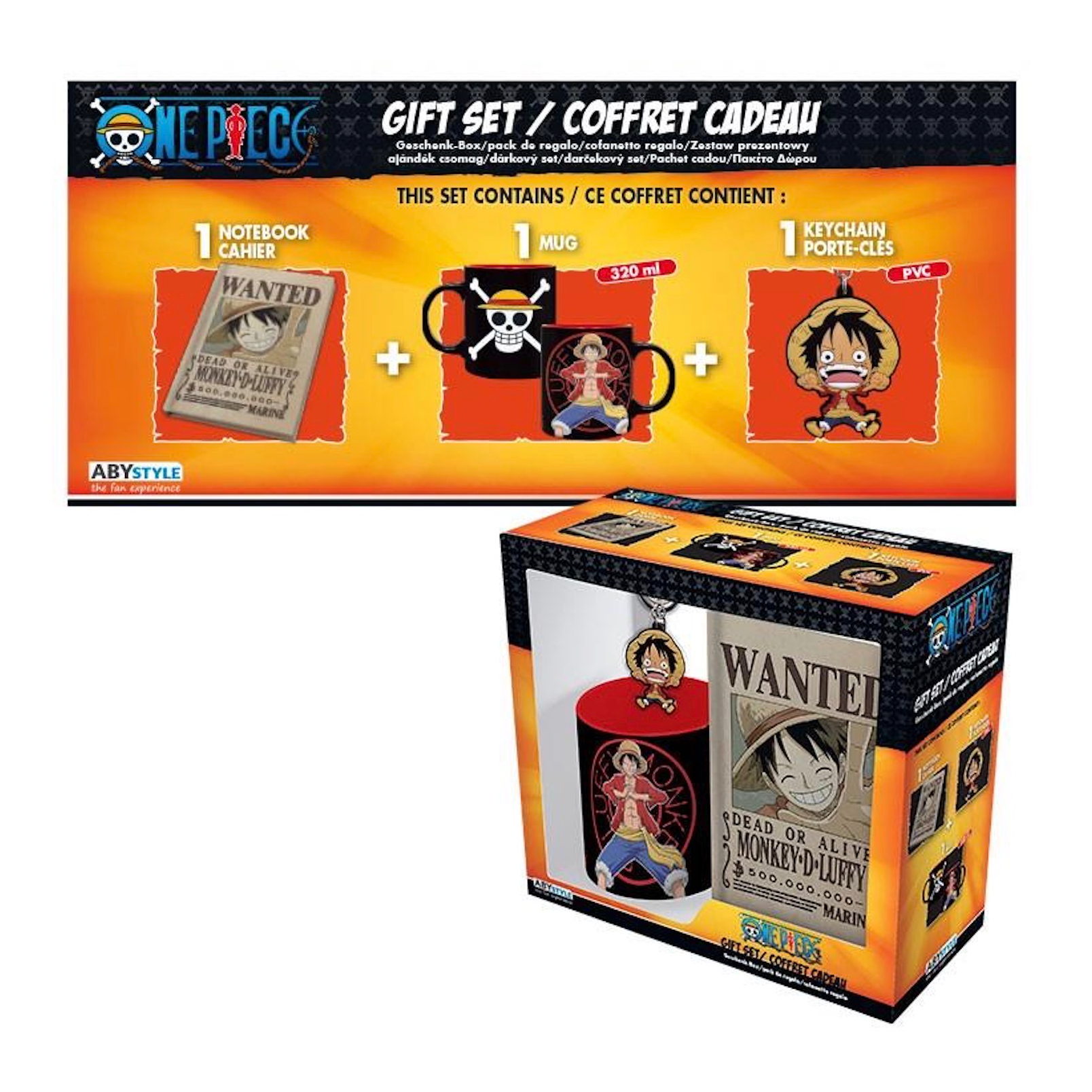 Set regalo composto da 1 Tazza da 320 ml con luffy, 1 portachiavi di pvc con la versione deformed del personaggio e1 notebook formato a6 con il cartello “wanted” in copertina.