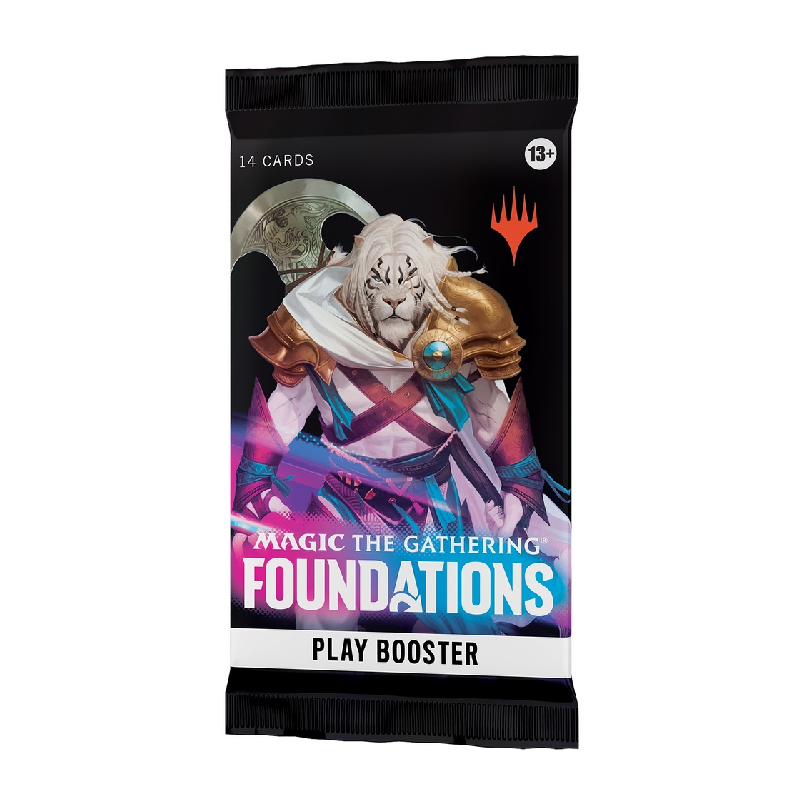 The best time to play your first Magic game is now. Dive into Foundations to create and share your quintessential Magic: The Gathering experience playing with and collecting cards selected to give every player the advantage. This Foundations Play Booster contains 14 Magic: The Gathering cards and 1 Token/Ad card or Art card. (A regular Art card can be found in 30% of packs and a foil-stamped Signature Art card can be found in 5% of packs.) Each pack includes a combination of 1–4 cards of rarity Rare or higher and 3–5 Uncommon, 6–9 Common, and 1 Land cards (Full-Art Land in 25% of packs). One card of any rarity is Traditional Foil. The Land card is also Traditional Foil in 20% of boosters.