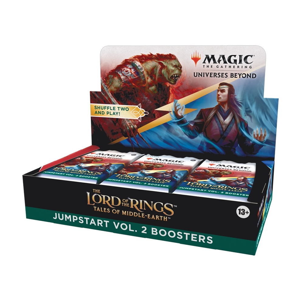 La confezione di buste di Jumpstart Vol. 2 de Il Signore degli Anelli: Racconti della Terra di Mezzo™ contiene 18 buste di Jumpstart Vol. 2 de Il Signore degli Anelli: Racconti della Terra di Mezzo. Ogni busta ha un tema. Prendi due buste e mischiale insieme per creare combinazioni folli e un’esperienza di gioco unica, ottima per una rapida partita, per fan di lunga data che vogliono ricominciare a giocare o per imparare a giocare in modo divertente. Ogni busta di Jumpstart Vol. 2 de Il Signore degli Anelli: Racconti della Terra di Mezzo contiene 20 carte di Magic (incluse tutte le terre necessarie per giocare). In ciascuna busta troverai 2 carte rare (1 carta rara progettata per le buste di Jumpstart e 1 rara o rara mitica dell’espansione principale) e 2 carte terra con un lucente trattamento foil tradizionale.
