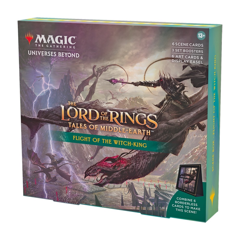 Le confezioni scena de Il Signore degli Anelli: Racconti della Terra di Mezzo™ contengono 6 carte scena foil senza bordo, 6 carte con illustrazione, 3 buste dell’espansione e un cavalletto di carta. Ogni busta dell’espansione contiene 12 carte di Magic, 1 carta con illustrazione e 1 carta pedina/promozionale, carta guida o carta della “Lista” (una speciale carta della storia di Magic, contenuta nel 25% delle buste), con una combinazione di una 1-4 carte di rarità rara o superiore e 3-7 non comuni, 3-7 comuni e 1 carta terra. Una terra foil sostituisce la carta terra base nel 20% delle buste dell’espansione e una carta con illustrazione e autografo foil dell’artista sostituisce la carta con illustrazione nel 10% delle buste dell’espansione.
