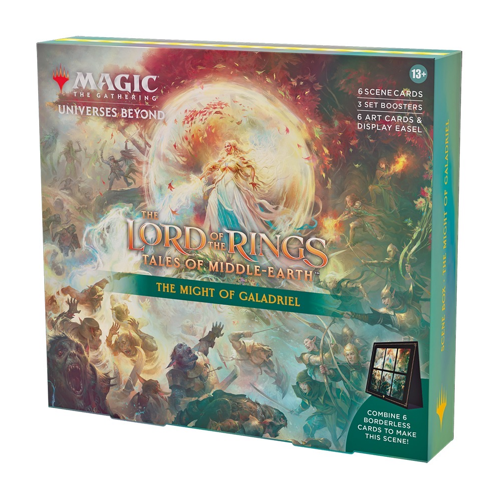 Le confezioni scena de Il Signore degli Anelli: Racconti della Terra di Mezzo™ contengono 6 carte scena foil senza bordo, 6 carte con illustrazione, 3 buste dell’espansione e un cavalletto di carta. Ogni busta dell’espansione contiene 12 carte di Magic, 1 carta con illustrazione e 1 carta pedina/promozionale, carta guida o carta della “Lista” (una speciale carta della storia di Magic, contenuta nel 25% delle buste), con una combinazione di una 1-4 carte di rarità rara o superiore e 3-7 non comuni, 3-7 comuni e 1 carta terra. Una terra foil sostituisce la carta terra base nel 20% delle buste dell’espansione e una carta con illustrazione e autografo foil dell’artista sostituisce la carta con illustrazione nel 10% delle buste dell’espansione.