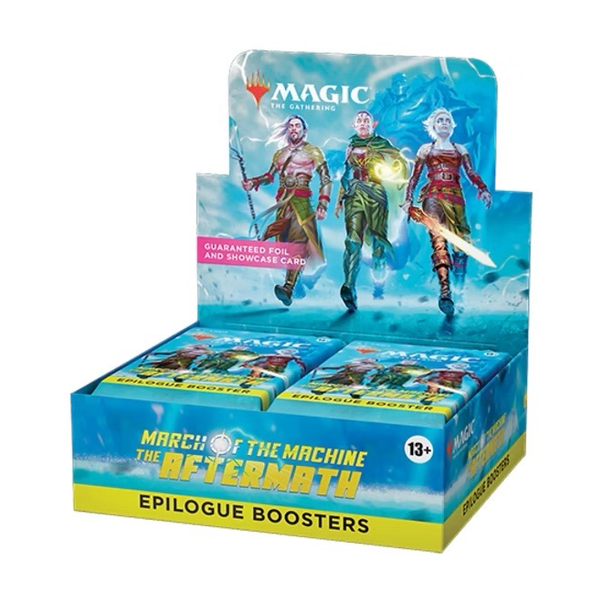 La confezione di buste Epilogo di L’Avanzata delle Macchine: L’Indomani contiene 24 buste Epilogo di L’Avanzata delle Macchine: L’Indomani. Ogni busta Epilogo contiene 5 carte, con una combinazione di 1-3 carte di rarità rara o superiore e 2-4 carte non comuni. Ogni busta contiene un totale di 1–2 carte foil di qualsiasi rarità.