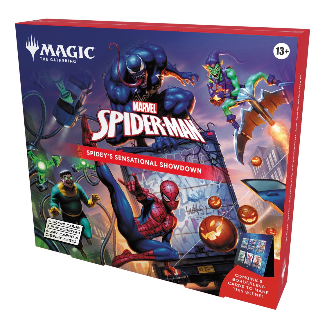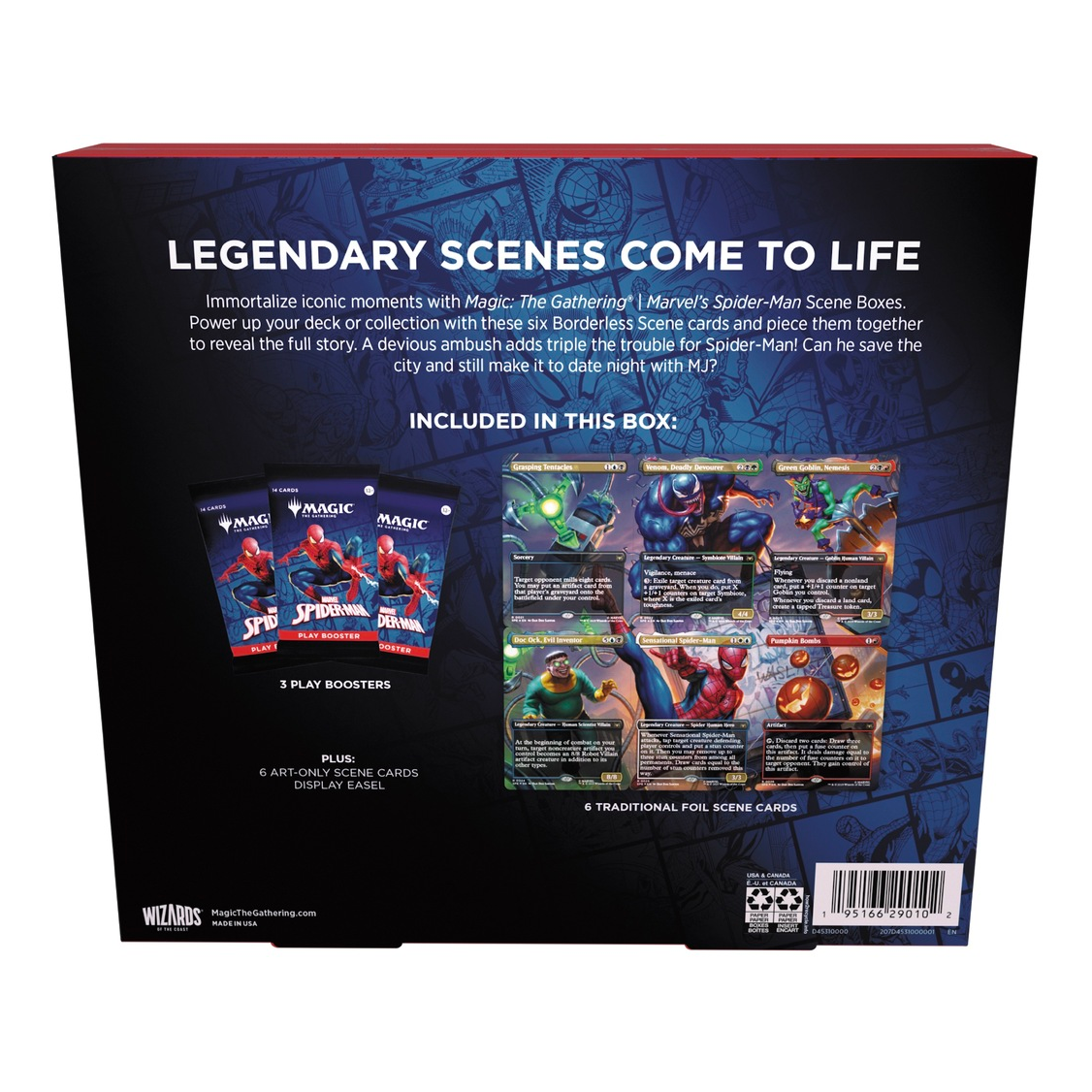 Immortalize an iconic moment with the Marvel’s Spider-Man Scene Box. Power up your deck or collection with these six Borderless Scene cards and piece them together to reveal the full story. A devious ambush adds triple the trouble for Spider-Man! Can he save the city and still make it to date night with MJ?