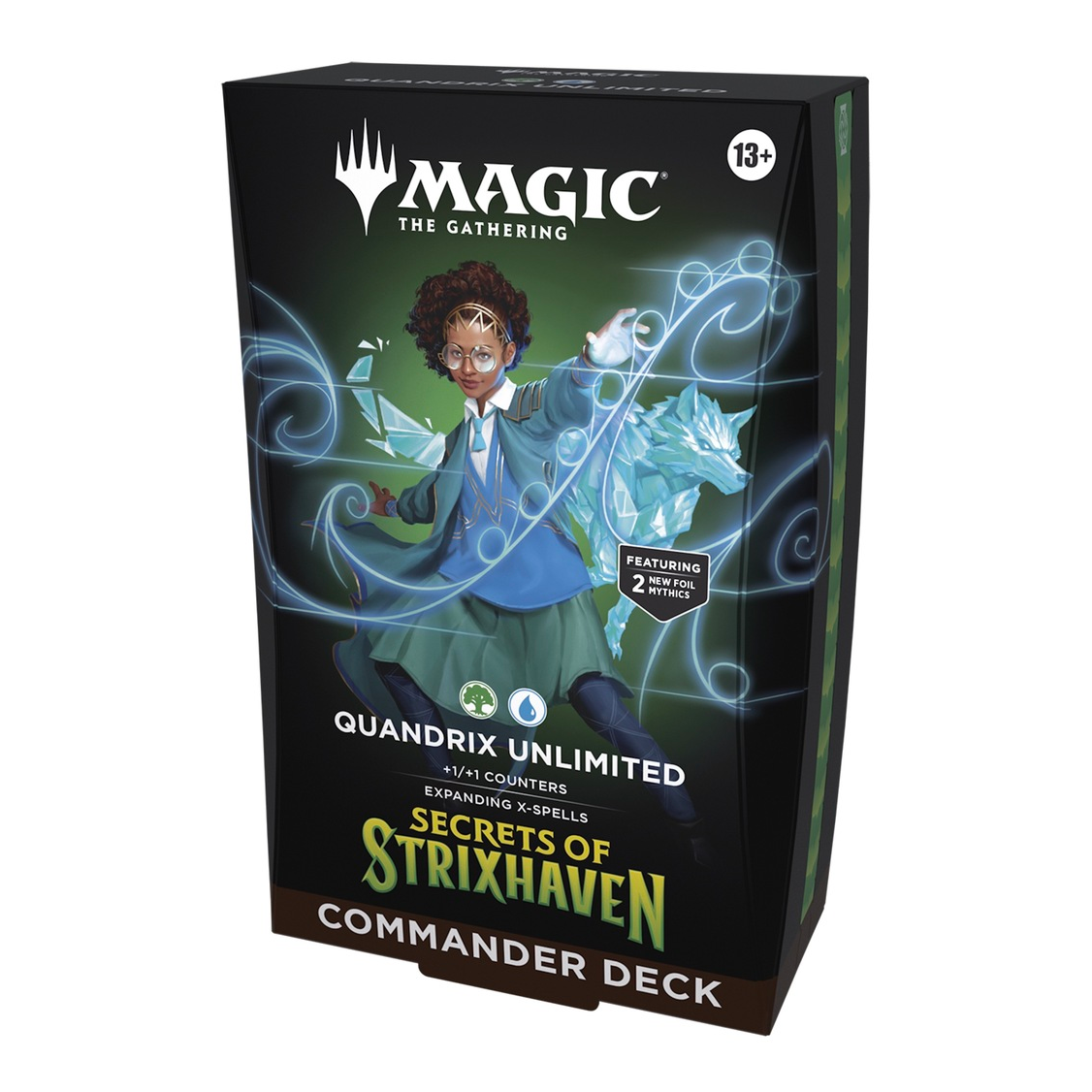 Dive into Magic’s most popular multiplayer format with five ready-to-play, 100-card decks, each with a unique two-color play style. Choose your college of magical study and expand your education in the greater world of Arcavios. Every Secrets of Strixhaven Commander Deck includes two traditional foil mythic rare legendary creature cards featuring borderless art that can be played as your commander, and each deck introduces 12 never-before-seen Commander cards to Magic: The Gathering.