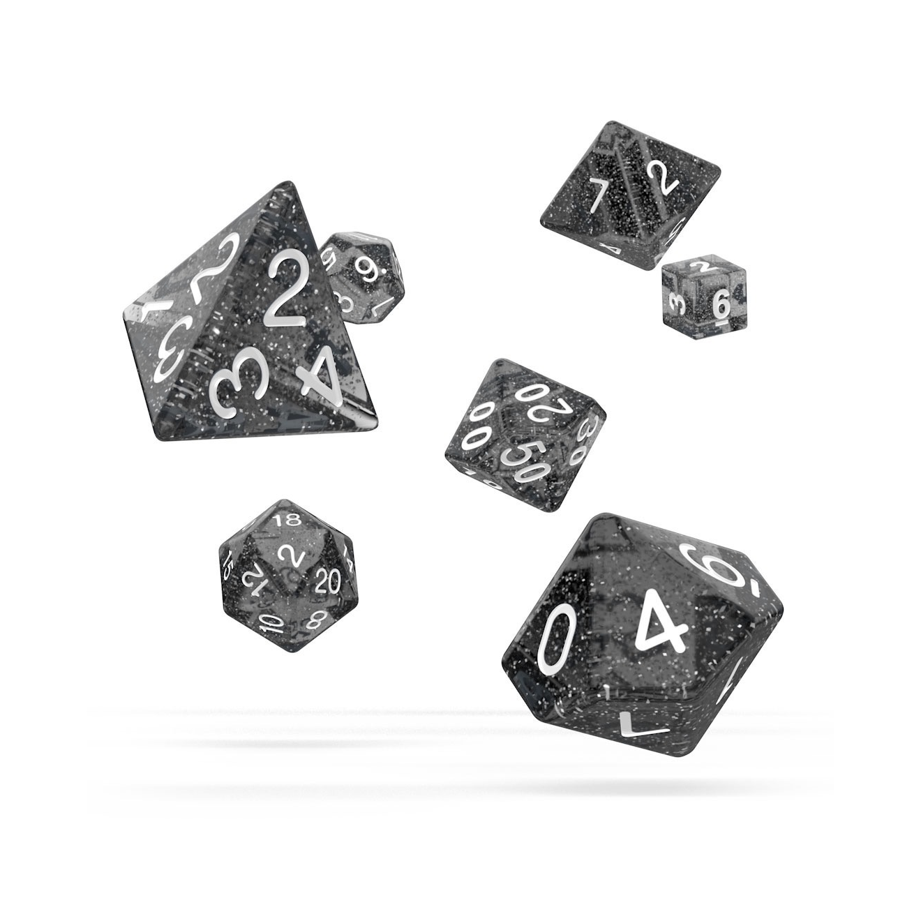 These dice bring a touch of magic to any game. Speckled with glitter, to some they seem to be filled with pixie dust, while others say they can see the milky way. What do you see?The Role-playing Game Sets consist of 7 different dice: D6, D4, 2x D10 (steps of 1 and steps of 10), D8, D20 and D12. They come packed in strong boxes with extendable shelves so you can easily take them with you and play wherever you want to.