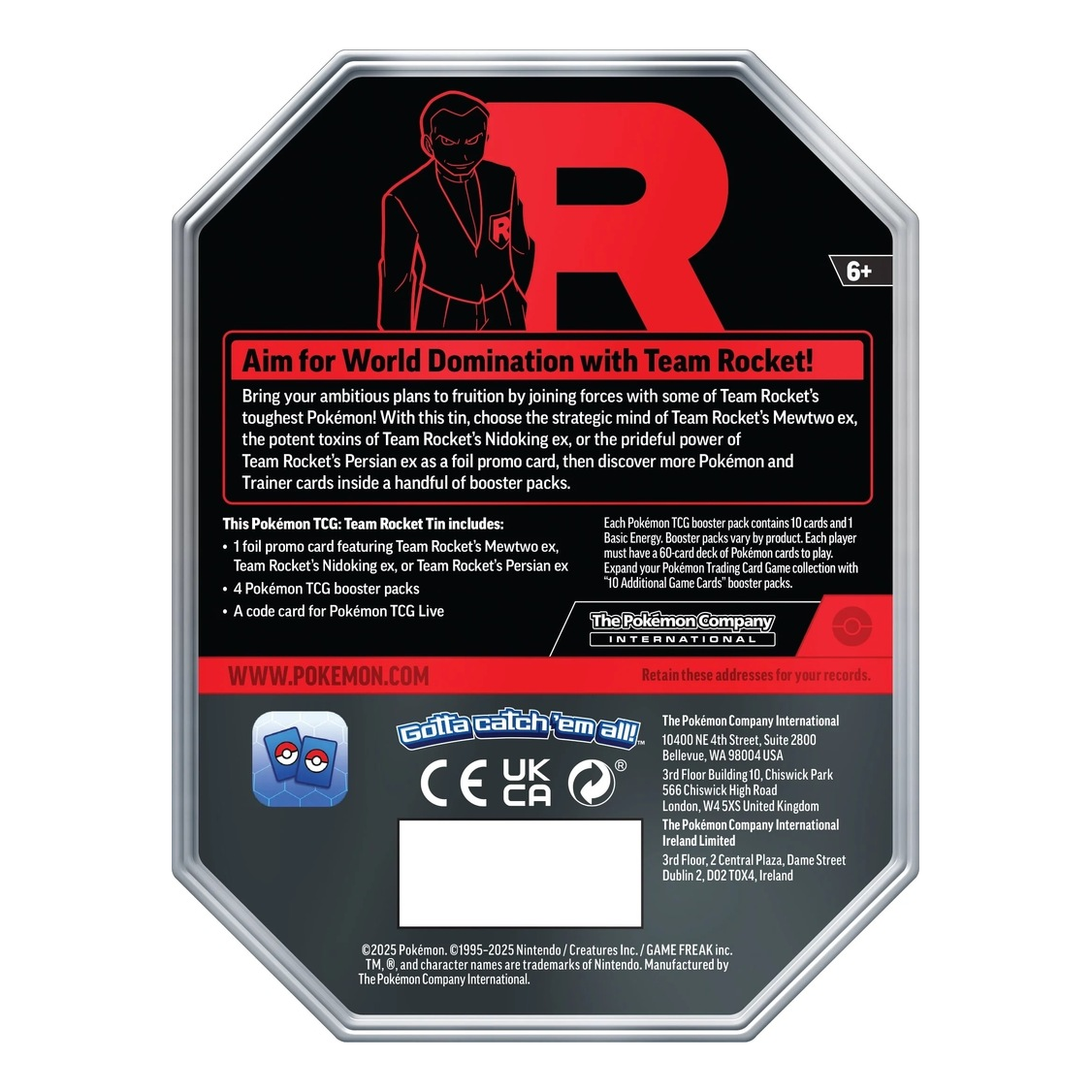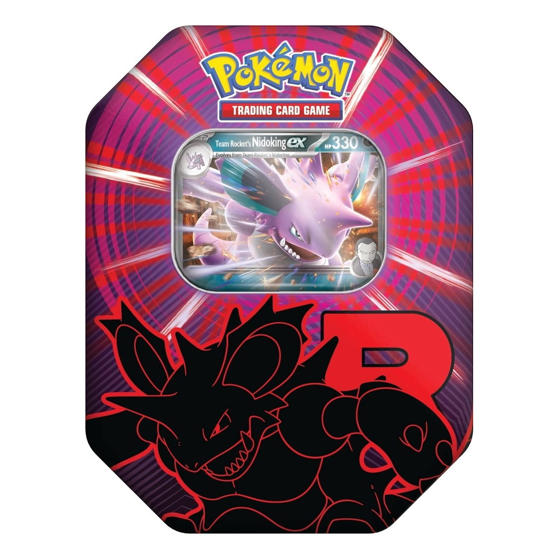 Bring your ambitious plans to fruition by joining forces with some of Team Rocket’s toughest Pokémon! With this tin, choose the strategic mind of Team Rocket’s Mewtwo ex, the potent toxins of Team Rocket’s Nidoking ex, or the prideful power of Team Rocket’s Persian ex as a foil promo card, then discover more Pokémon and Trainer cards inside a handful of booster packs.