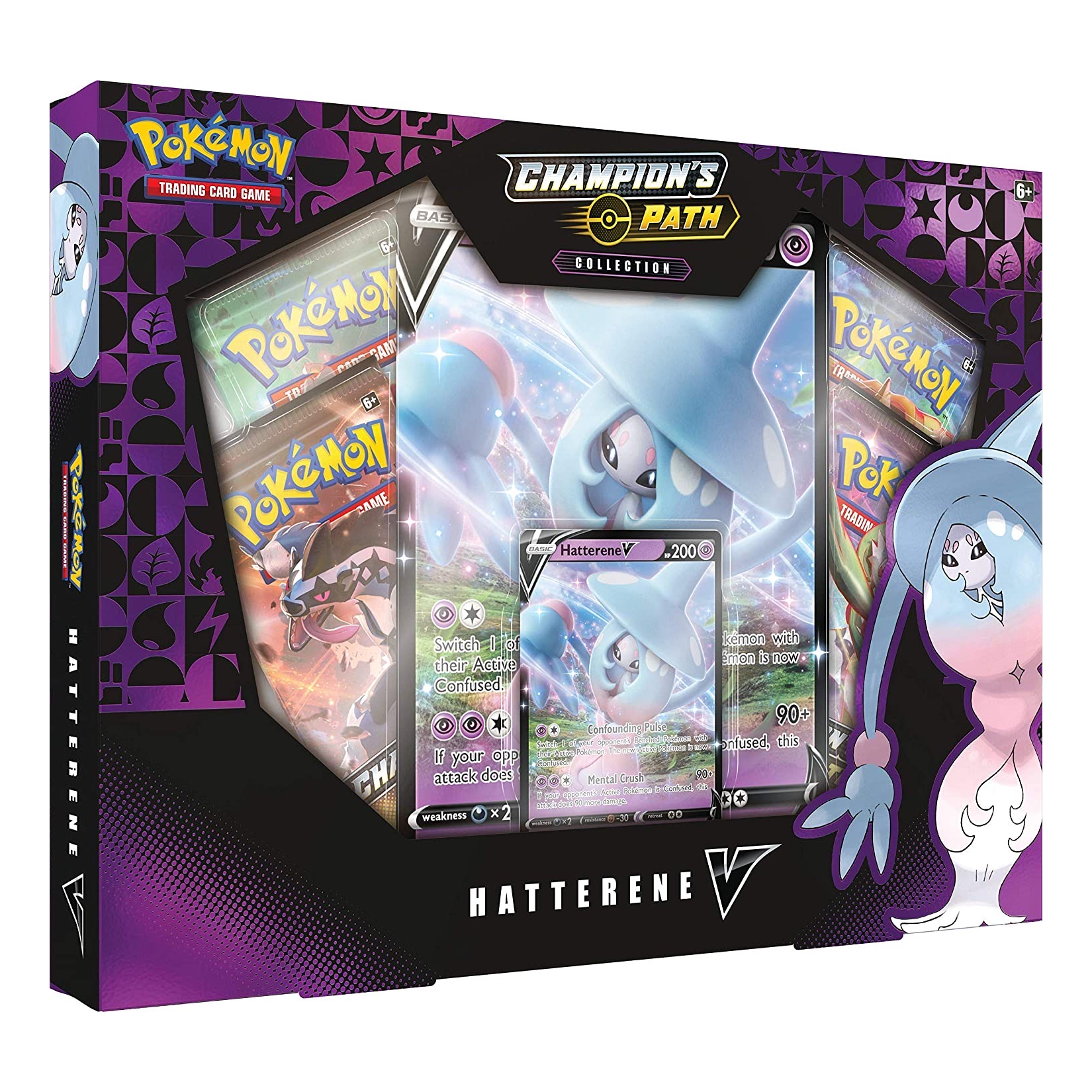 When you find Hatterene in the Galar region, you won’t hear much—but this Pokémon’s silence speaks louder than most! With its perplexing moves and awesome Psychic-type powers, Hatterene V leaves foes weak and confused, then glides away on its own mysterious errands. In this Pokémon TCG: Champion’s Path Collection, you’ll get Hatterene V as a playable foil promo card and a fantastic oversize card. You’ll also discover more surprises in Pokémon TCG: Champion’s Path booster packs!