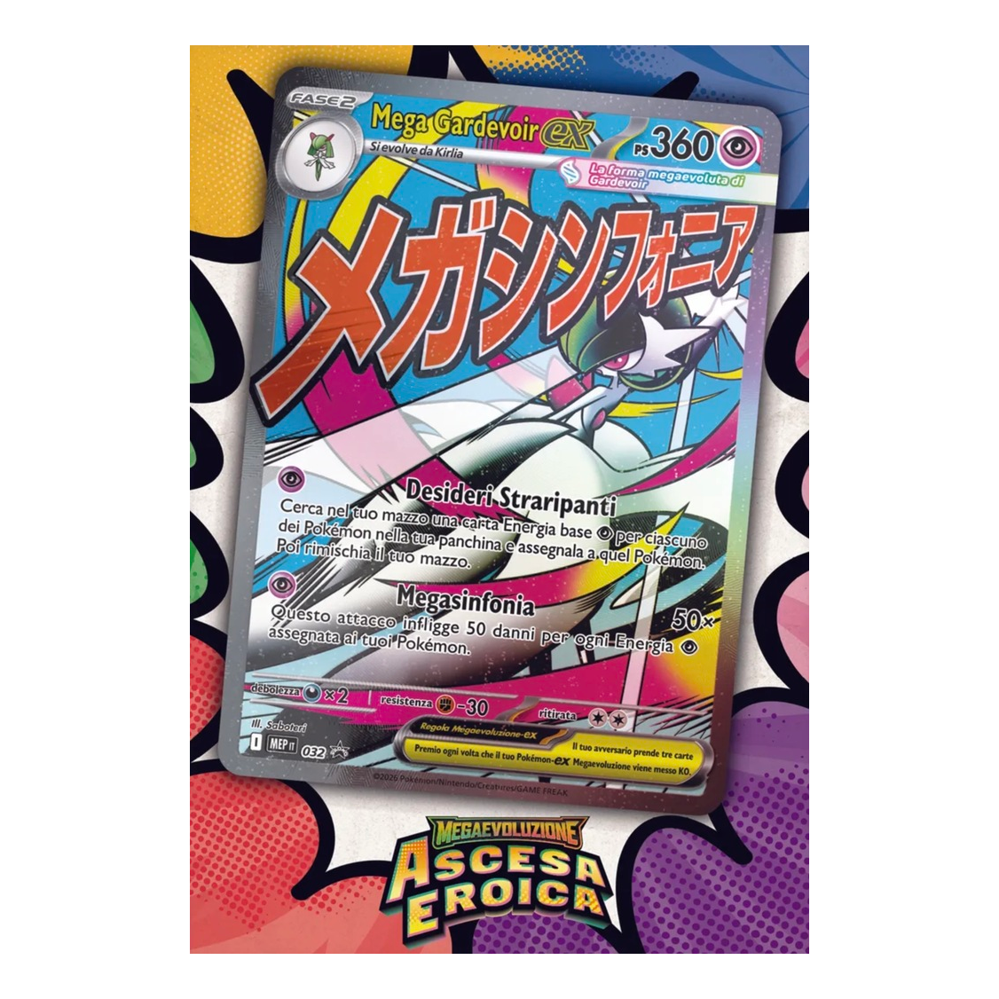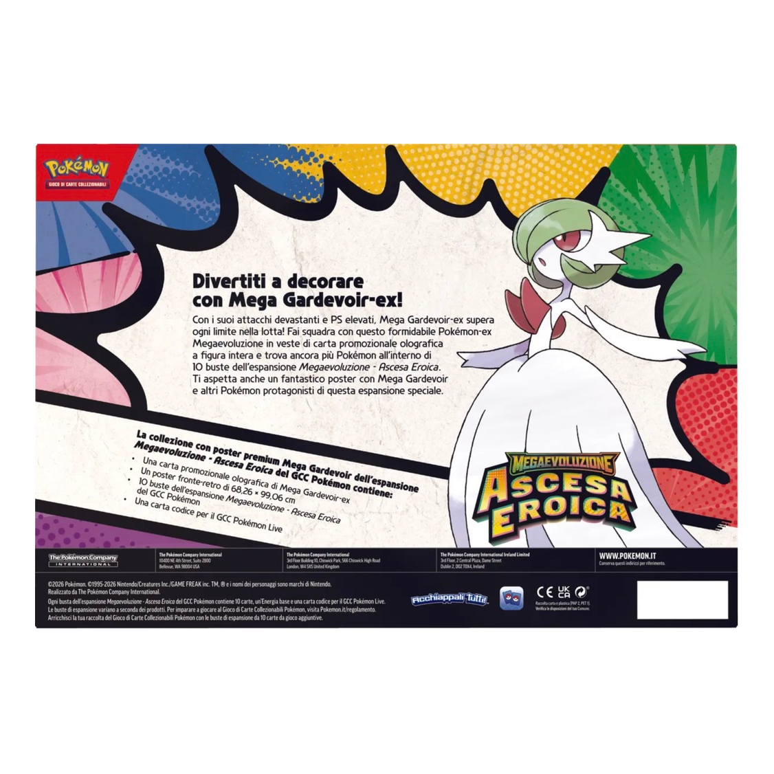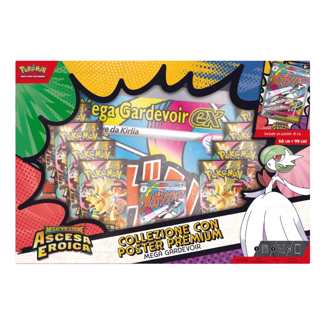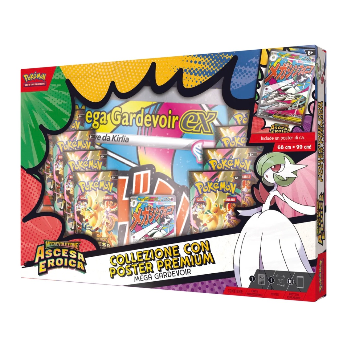 Con i suoi attacchi devastanti e PS elevati, Mega Gardevoir-ex supera ogni limite nella lotta! Fai squadra con questo formidabile Pokémon-ex Megaevoluzione in veste di carta promozionale olografica a figura intera e trova ancora più Pokémon all’interno di 10 buste dell’espansione Megaevoluzione – Ascesa Eroica. Ti aspetta anche un fantastico poster con Mega Gardevoir e altri Pokémon protagonisti di questa espansione speciale.