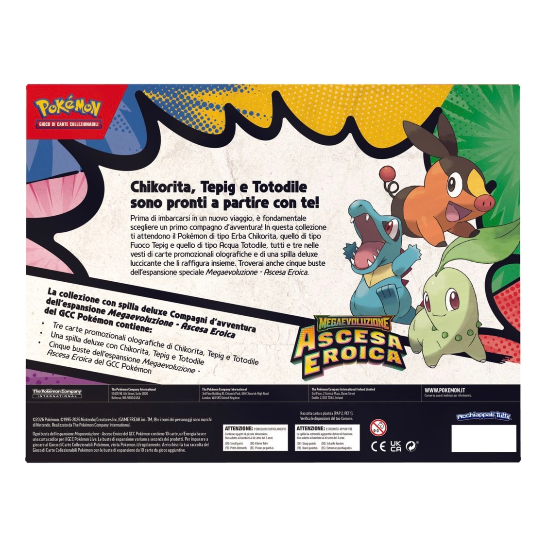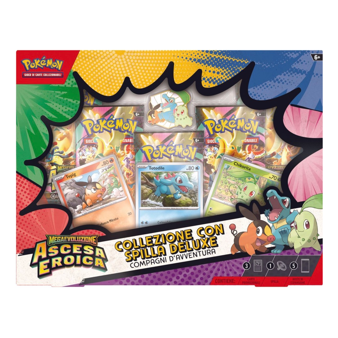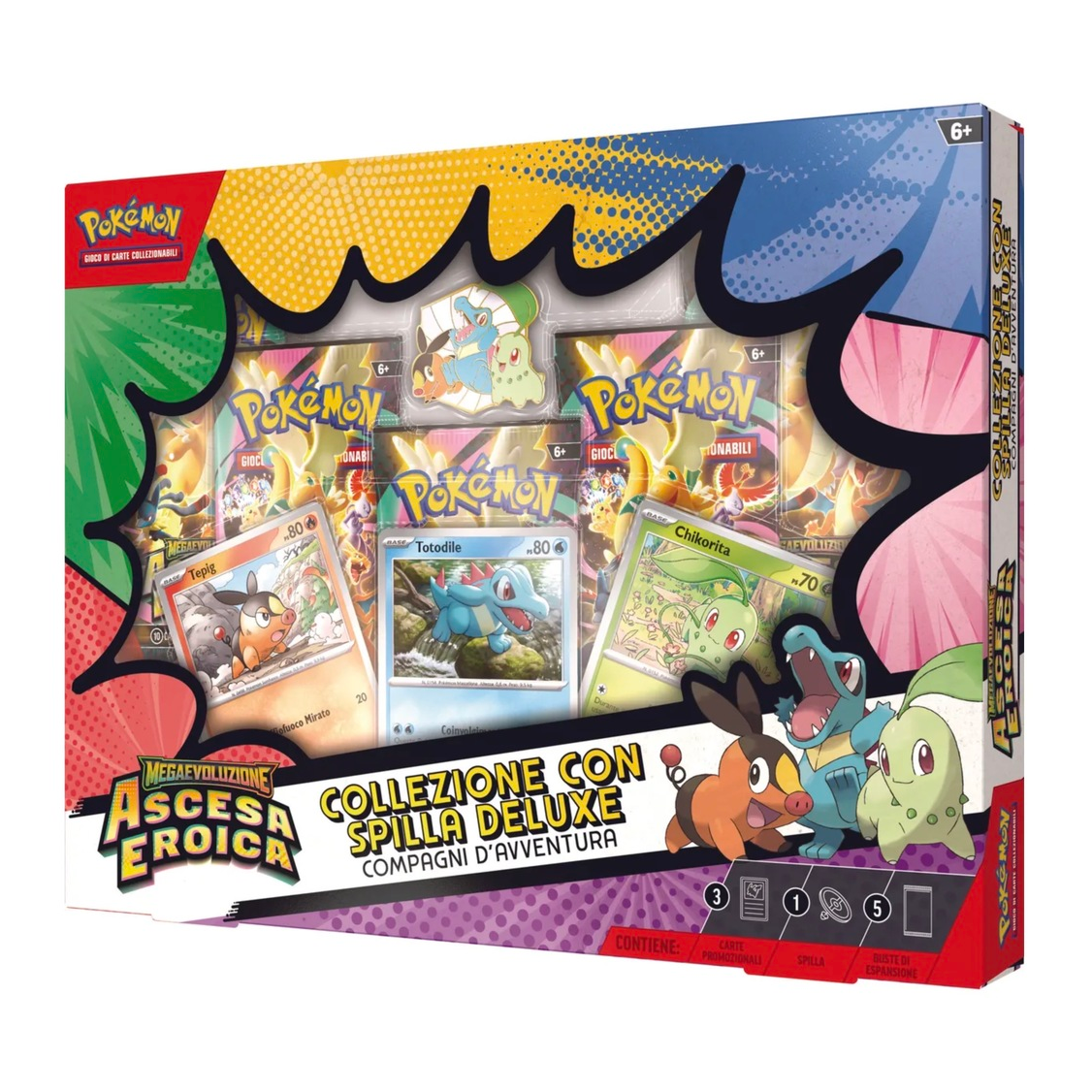 Prima di imbarcarsi in un nuovo viaggio, è fondamentale scegliere un primo compagno d’avventura! In questa collezione ti attendono il Pokémon di tipo Erba Chikorita, quello di tipo Fuoco Tepig e quello di tipo Acqua Totodile, tutti e tre nelle vesti di carte promozionali olografiche e di una spilla deluxe luccicante che li raffigura insieme. Troverai anche cinque buste dell’espansione speciale Megaevoluzione – Ascesa Eroica.