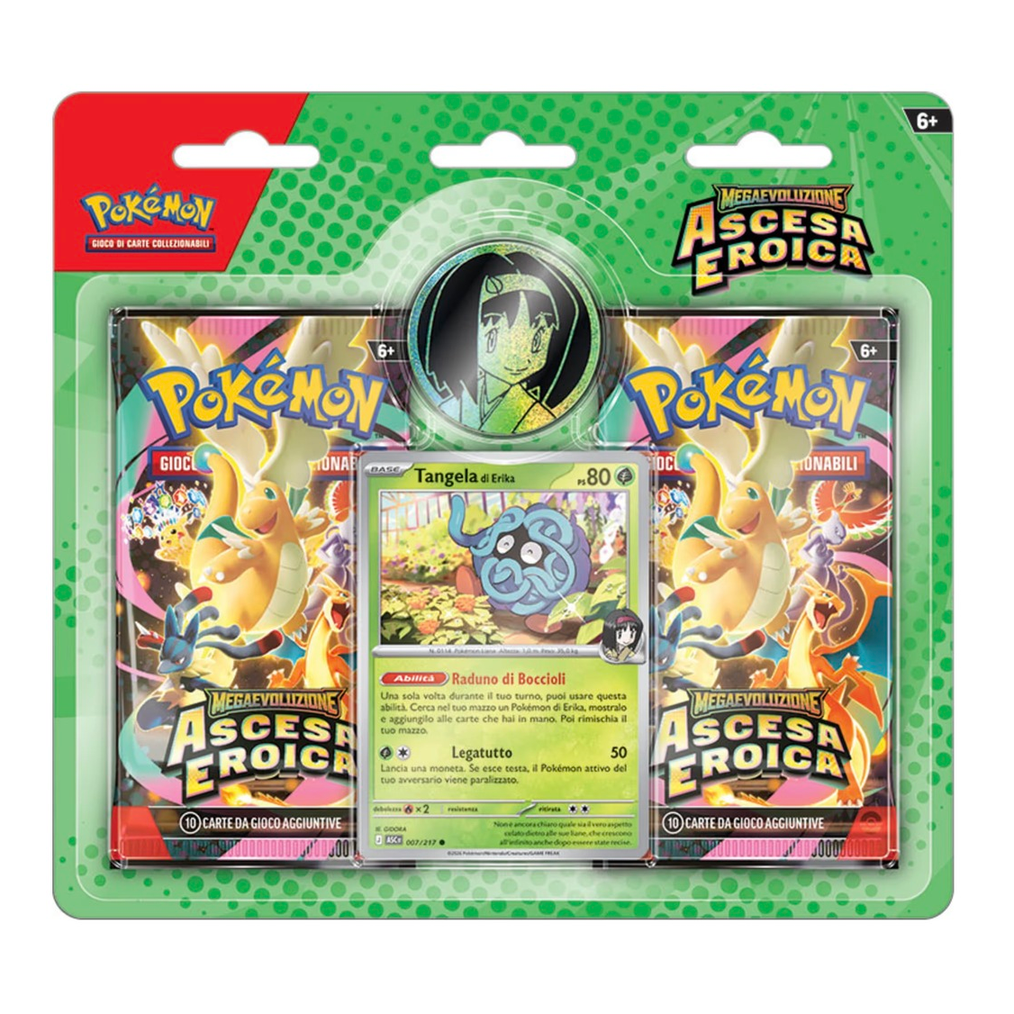 La Palestra di Azzurropoli, gestita dalla Capopalestra Erika, è piena di rigogliosa vegetazione e Pokémon di tipo Erba. Chi visita Mesturia, nella regione di Paldea, ha l’opportunità di sfidare il Capopalestra Ubaldo e i suoi Pokémon di tipo Normale. In questa collezione troverai Tangela di Erika nelle vesti di carta promozionale insieme a una moneta che ritrae il Capopalestra scelto, nonché due buste dell’espansione Megaevoluzione – Ascesa Eroica.