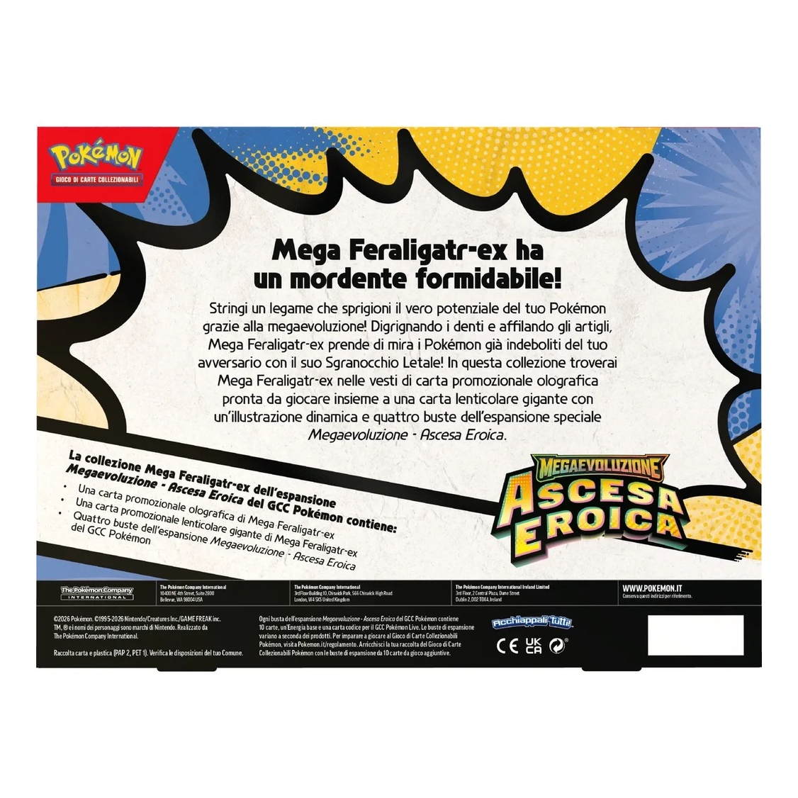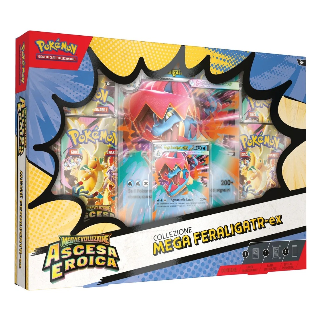 In questa collezione troverai Mega Feraligatr-ex nelle vesti di carta promozionale olografica pronta da giocare insieme a una carta lenticolare gigante con un’illustrazione dinamica e quattro buste dell’espansione speciale Megaevoluzione – Ascesa Eroica.