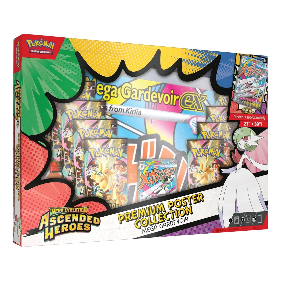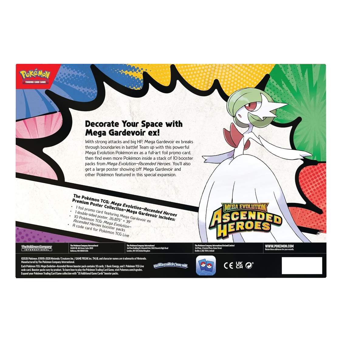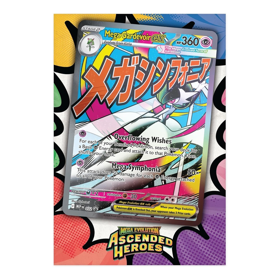 With strong attacks and big HP, Mega Gardevoir ex break through boundaries in battle! Team up with This powerful Mega Evolution Pokémon ex as a full-art foil promo card , then find even more Pokémon inside a stack of 10 booster packs from Mega Evolution—Ascended Heroes. You’ll also get a large poster showing off Mega LGardevoir and other Pokémon featured in this special expansion.