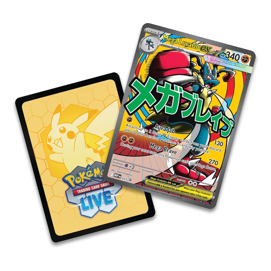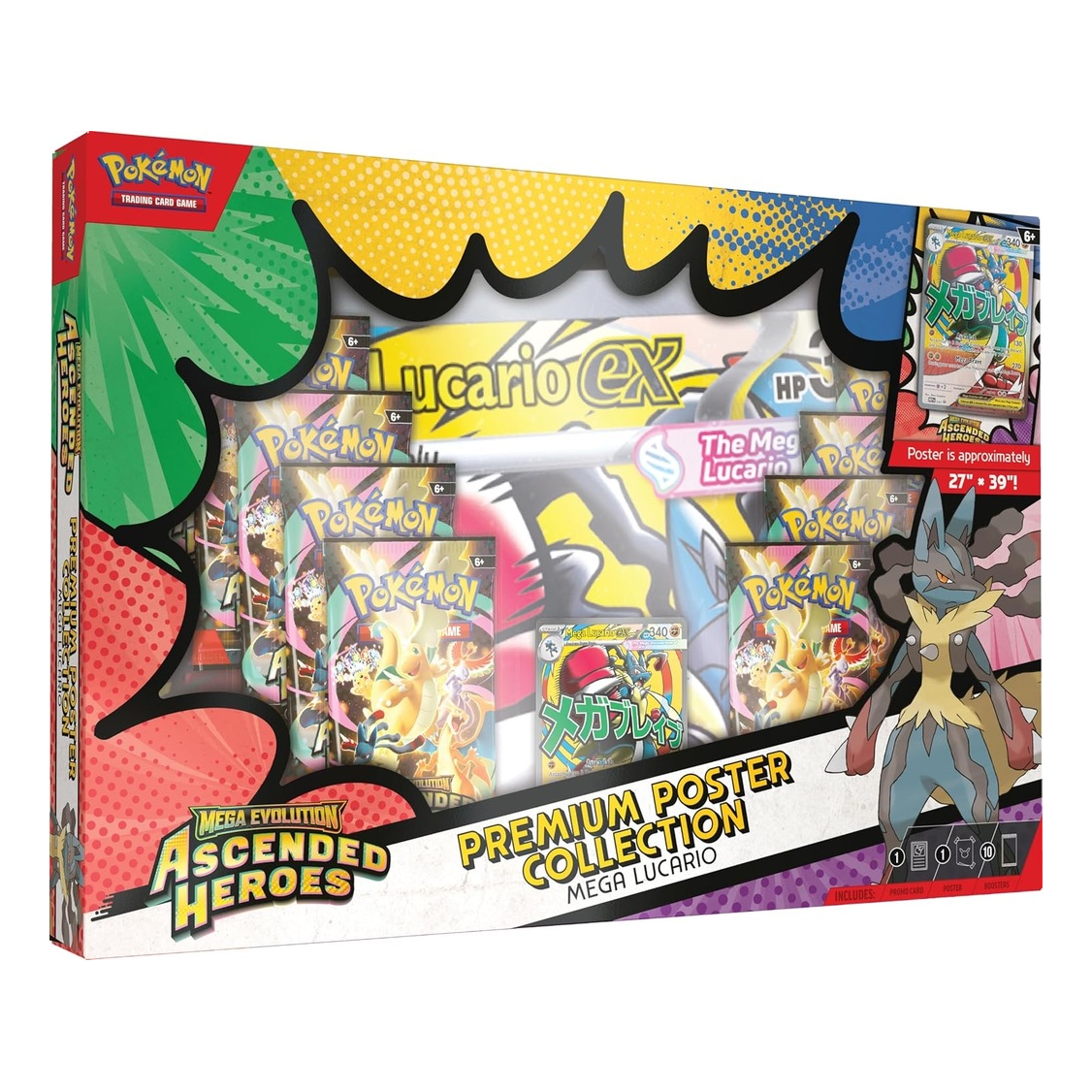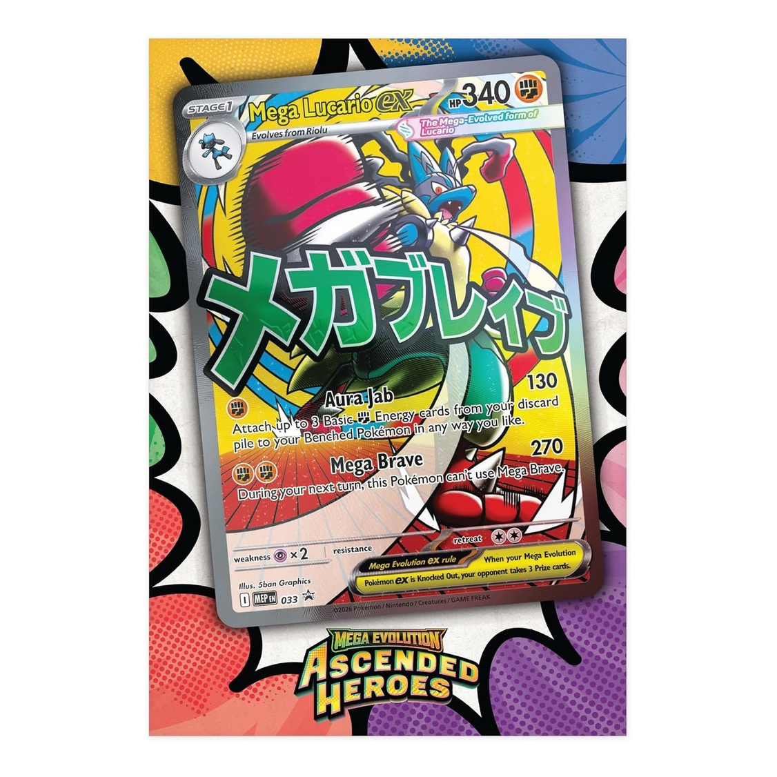 With strong attacks and big HP, Mega Lucario ex and break through boundaries in battle! Team up with This powerful Mega Evolution Pokémon ex as a full-art foil promo card , then find even more Pokémon inside a stack of 10 booster packs from Mega Evolution—Ascended Heroes. You’ll also get a large poster showing off Mega Lucario and other Pokémon featured in this special expansion.
