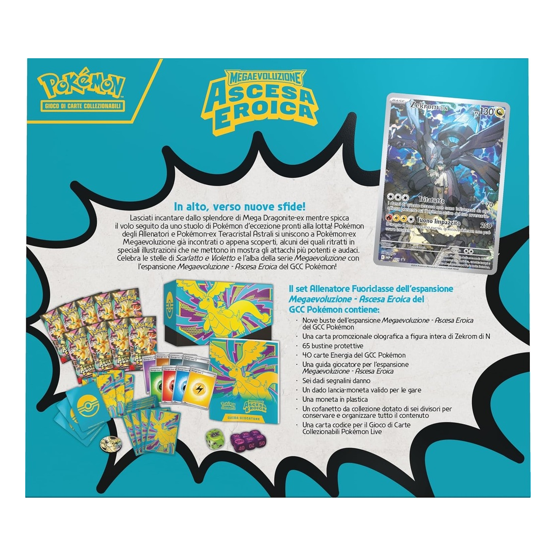 Porta la tua passione per il Gioco di Carte Collezionabili Pokémon al massimo con ilPokemon ITA MEGAEVO Ascesa Eroica Set Allenatore Fuoriclasse! Questo set deluxe è il sogno di ogni collezionista italiano, dedicato all’espansioneMegaevoluzione – Ascesa Eroica. All’interno del cofanetto da collezione con sei divisori pratici, troverainove buste boosterpiene di carte potenti, inclusa unacarta promozionale olografica a figura intera di Zekrom di N– un pezzo raro e iconico per potenziare mazzi elettrici e strategie eroiche.