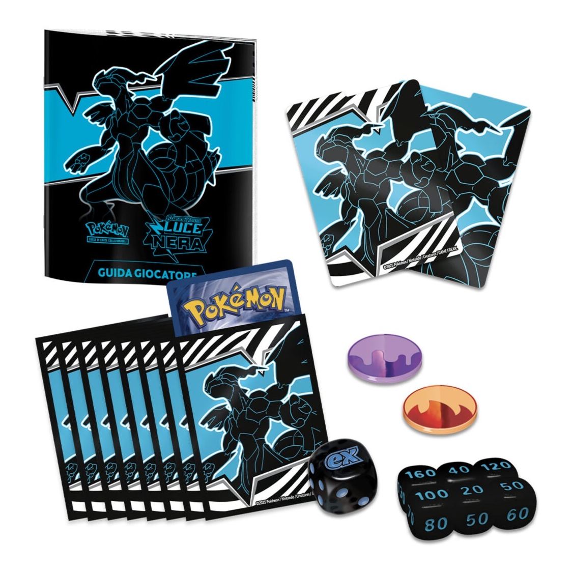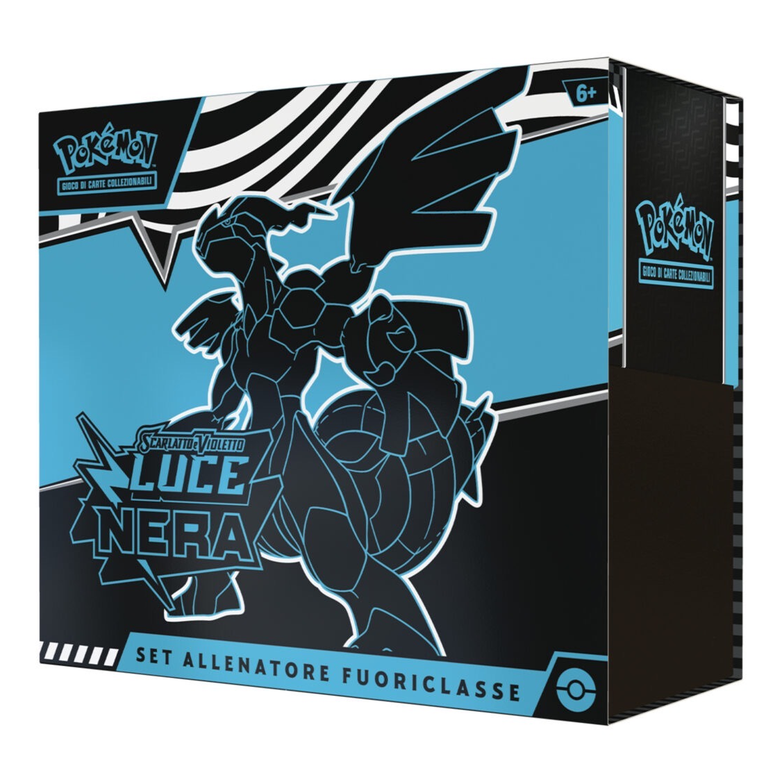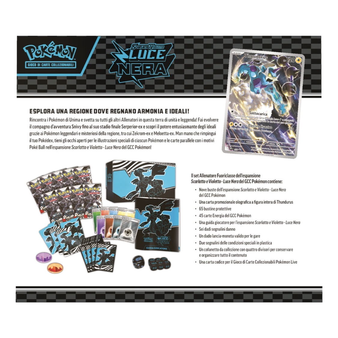 Il set Allenatore Fuoriclasse dell’espansione Scarlatto e Violetto – Luce Nera del GCC Pokémon contiene:• Nove buste dell’espansione Scarlatto e Violetto – Luce Nera del GCC Pokémon• Una carta promozionale olografica a figura intera di Thundurus• 65 bustine protettive• 45 carte Energia del GCC Pokémon• Una guida giocatore per l’espansione Scarlatto e Violetto – Luce Nera• Sei dadi segnalini danno• Un dado lancia-moneta valido per le gare• Due segnalini delle condizioni speciali in plastica• Un cofanetto da collezione con quattro divisori per conservare e organizzare tutto il contenuto• Una carta codice per il Gioco di Carte Collezionabili Pokémon Live