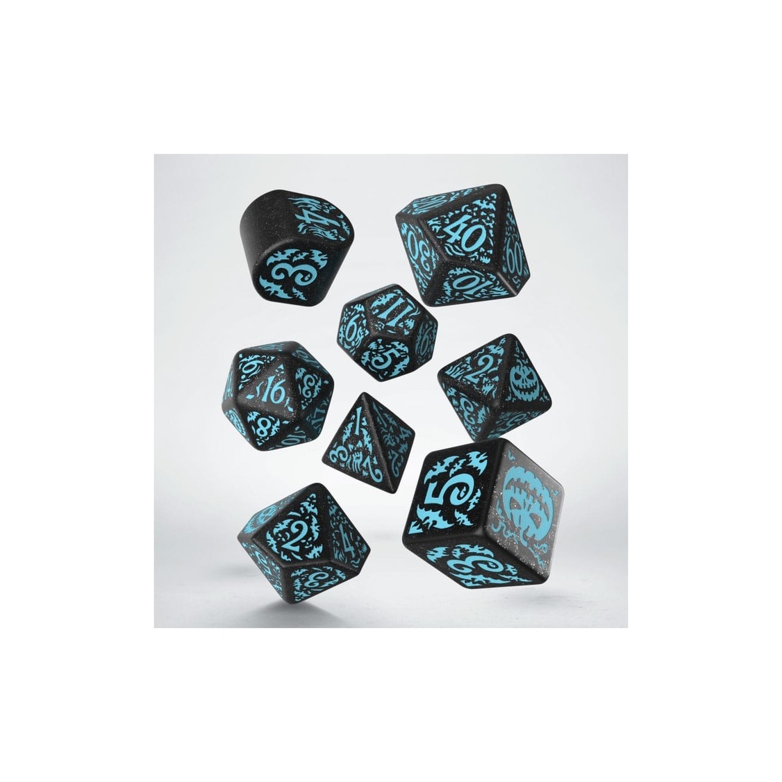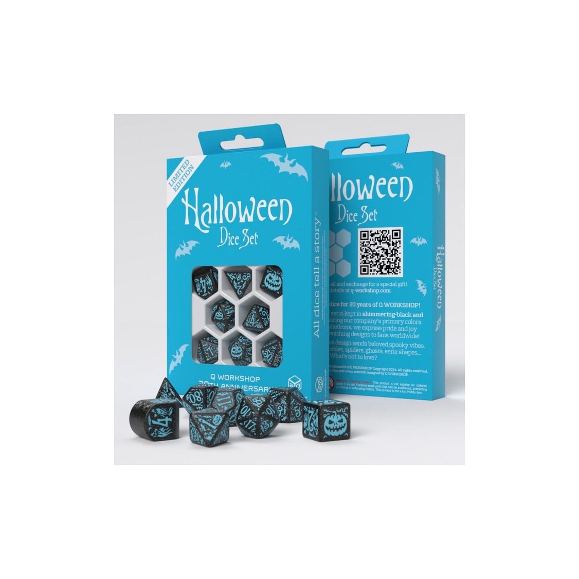 Q WORKSHOP 20 YEARS: Halloween Dice Set, a new color variant for our spooky design. It creates a fantastic atmosphere thanks to bats, ghosts, and pumpkin heads next to clear digits. The turquoise paintings on the shimmering-black background infused with glitter dust
