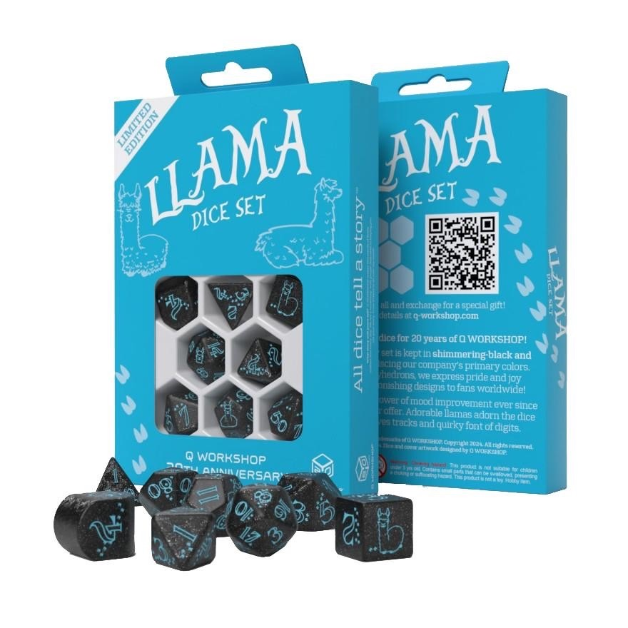 Llama Dice for 20th anniversary! Presenting the Q WORKSHOP 20 YEARS: Llama Dice Set, a new color variant for our beloved design. Swirly digits are accompanied by hooves’ trails and llamas in various poses. The turquoise paintings on the shimmering – black background infused with glitter dust symbolize two decades of our company’s existence.