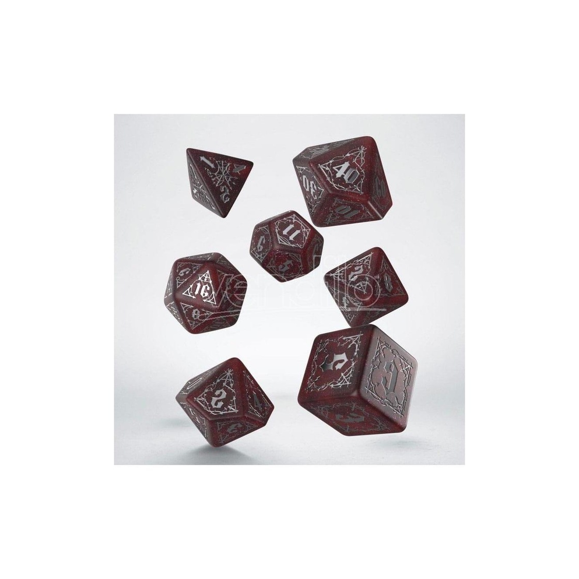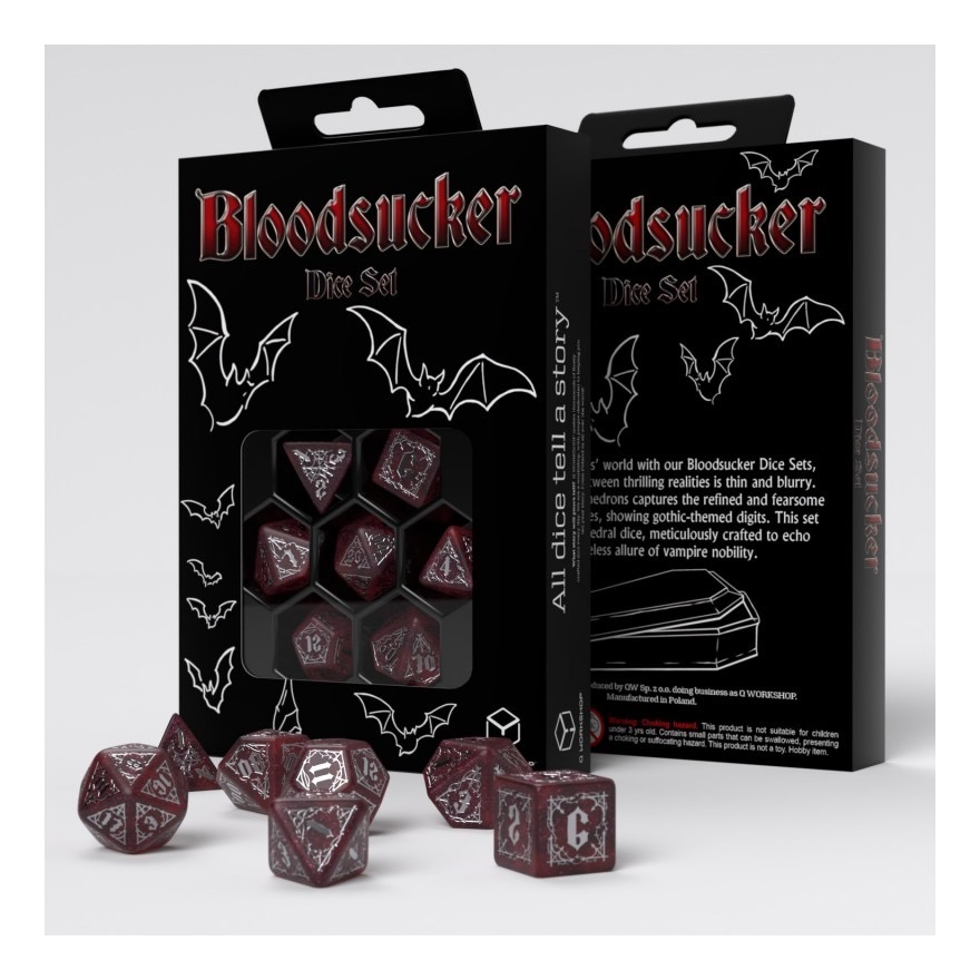 From the depths of ancient crypts and the shadows of forgotten tombs emerges the Bloodsucker Dice Set: Scarlet, a unique weapon of the dark forces. The crimson red hue and the intricate silver adornments, worthy of the highest vampire houses, make this dice set an essential piece of equipment for anyone venturing into worlds haunted by undead creatures.