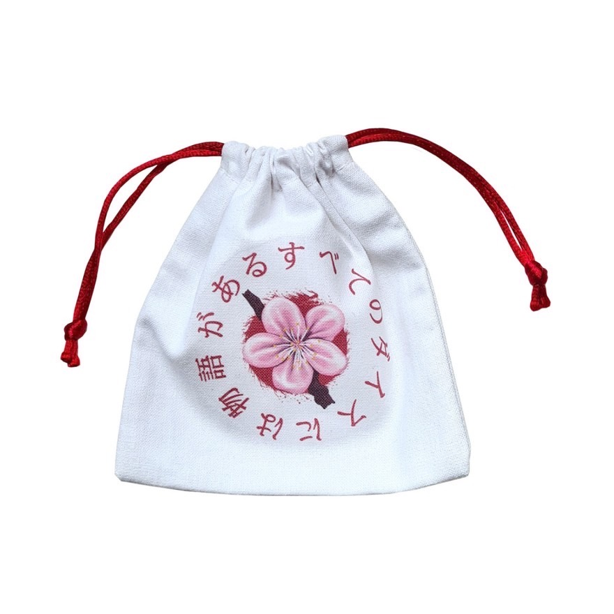 Meaningful colors — The color theme for this dice bag features a white background, deep-red closing strings, and a colored print of the Sakura flower on the front.