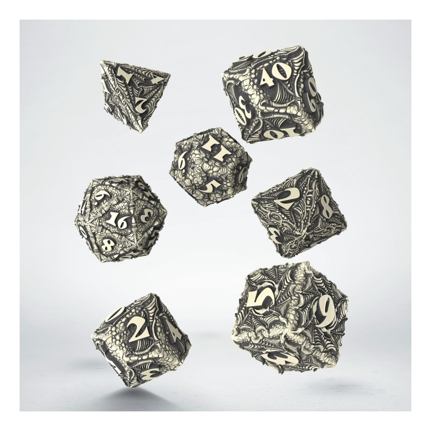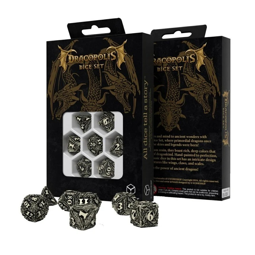 Discover the Dracopolis Dice Set: the Scandinavian Blackfang! We present our legendary dragon-themed dice based on archeological findings in Scandinavian fjords. Intricate 3D designs of claws, wings, bones, and scales adorn each dice, making every roll a journey into dragon lore. The beige resin material painted black with cleared digits brings out the essence of ancient dragons.