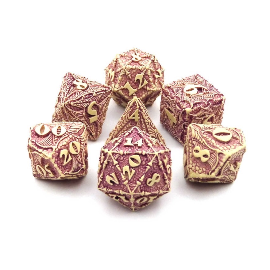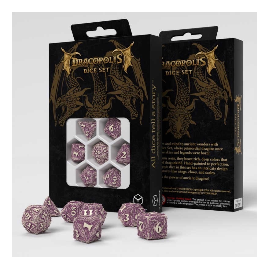 Behold the Dracopolis Dice Set: the Yucatan Featherwing! We present our legendary dragon-themed dice based on archeological findings in the forests of Mesoamerica. Intricate 3D designs of claws, wings, bones, and scales adorn each dice, making every roll a journey into dragon lore. The beige resin material painted purple with cleared digits brings out the mystery of feathered dragons.