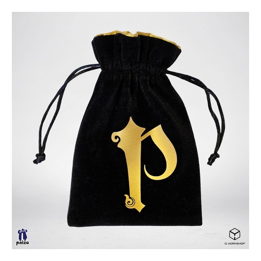 This exceptional gaming prop is a bag woven from sturdy velour with satin lining, which gives your polyhedrons comfort and security at the same time. It is closed with durable polyester strings to keep them from wandering about. The universally elegant color theme of black material with golden print inspires respect and style, especially when the well-known Pathfinder logo adorns the front.