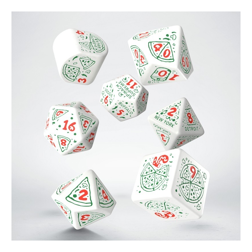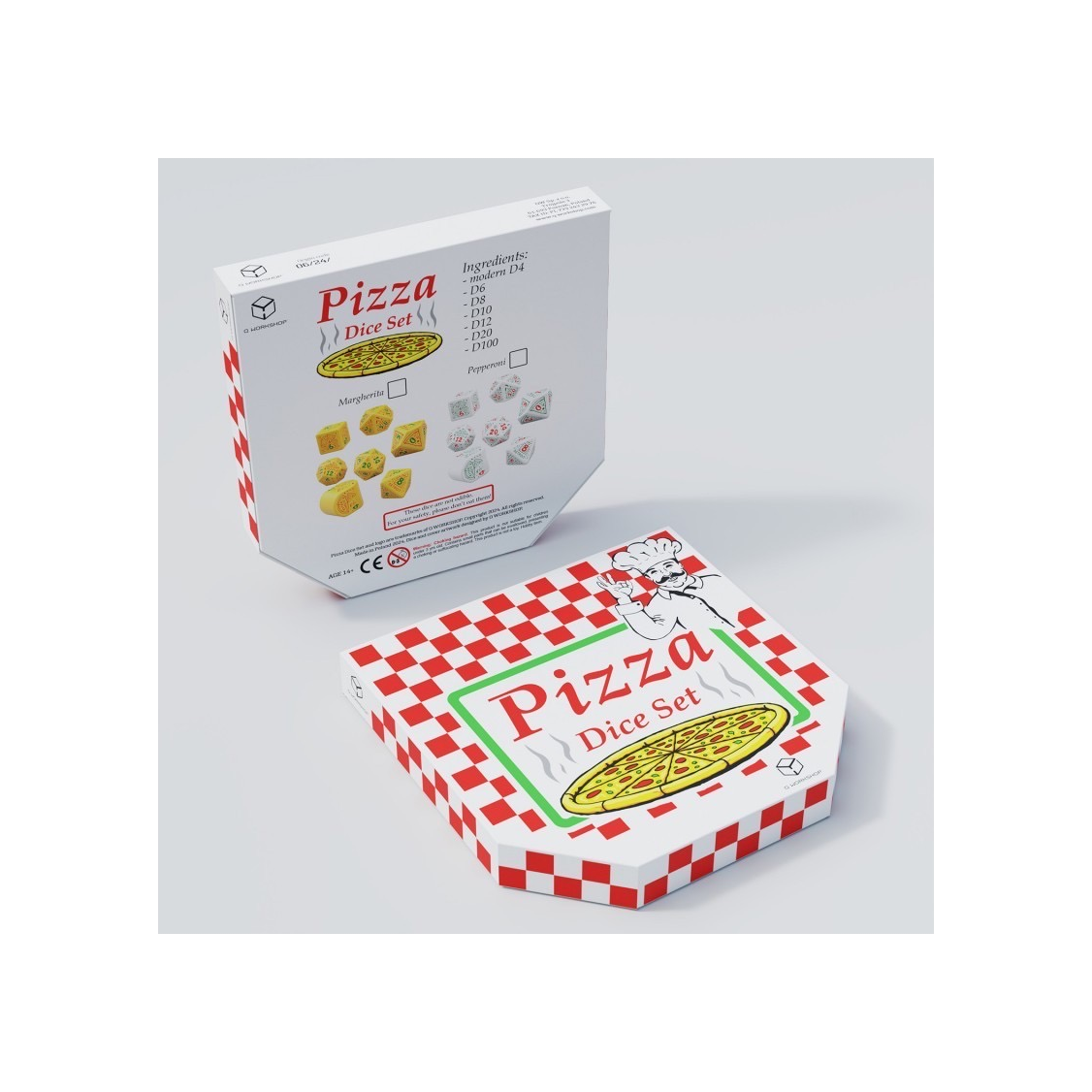 Spicy treat, coming along! The most popular snack at RPG sessions gets a tribute! The Pizza Dice Set: Pepperoni, inspired by this classic dish in a spicy form, brings a tasty atmosphere to the world of role-playing games. White dice with green symbols and red digits, in a box resembling an Italian pizza, allow you to roll for pizza style, toppings, and extra treats. Grab and roll it out!