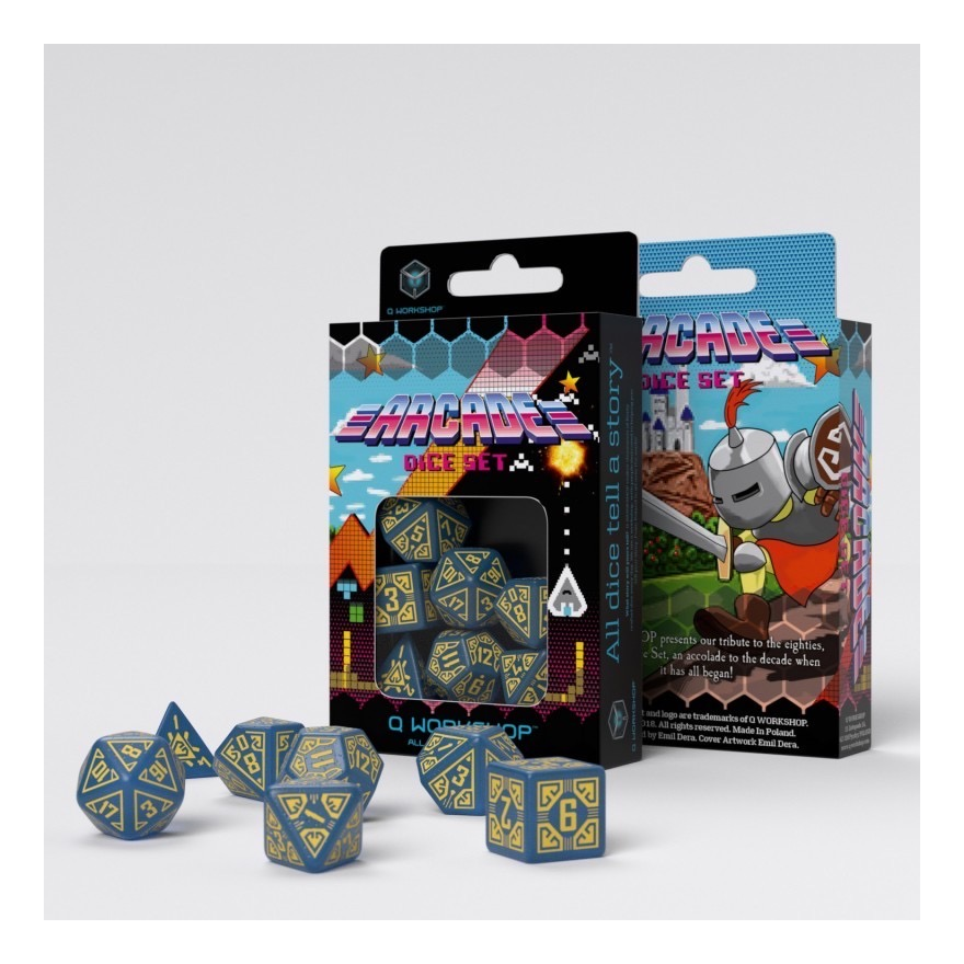 Q WORKSHOP proudly introduces Arcade Dice Set – our tribute to the times when boys and girls on sturdy bikes started delving into dungeons and defeating dragons. The arcade was the sacred place for all gamers – place of meetings, duels and bonding. Many have found friends for life there. This set is an accolade to the decade when it has all begun and was as fresh as new. There are the same might and magic in this set as in the adventures set in the worlds of first fantasy RPGs. It’s not important if you have played the barbarian, plumber or master of the universe. This glossy blue dice set is our call of the game, the trigger of the time of fun, that like a rogue can steal many hours from your life but gives a chance for unique experience and joy. Its real king’s bounty for all gamers, even the paint is bright yellow as king’s crown. The complexly elaborated engravings are stylised as festoons on the arcade cabinet. Even the elegant box looks like one of them. This is your round for “Knight of the Arcade” game, with your BFFs and other kids (or grown-ups with charming hearts and living inner child) that can be your future BFFs.