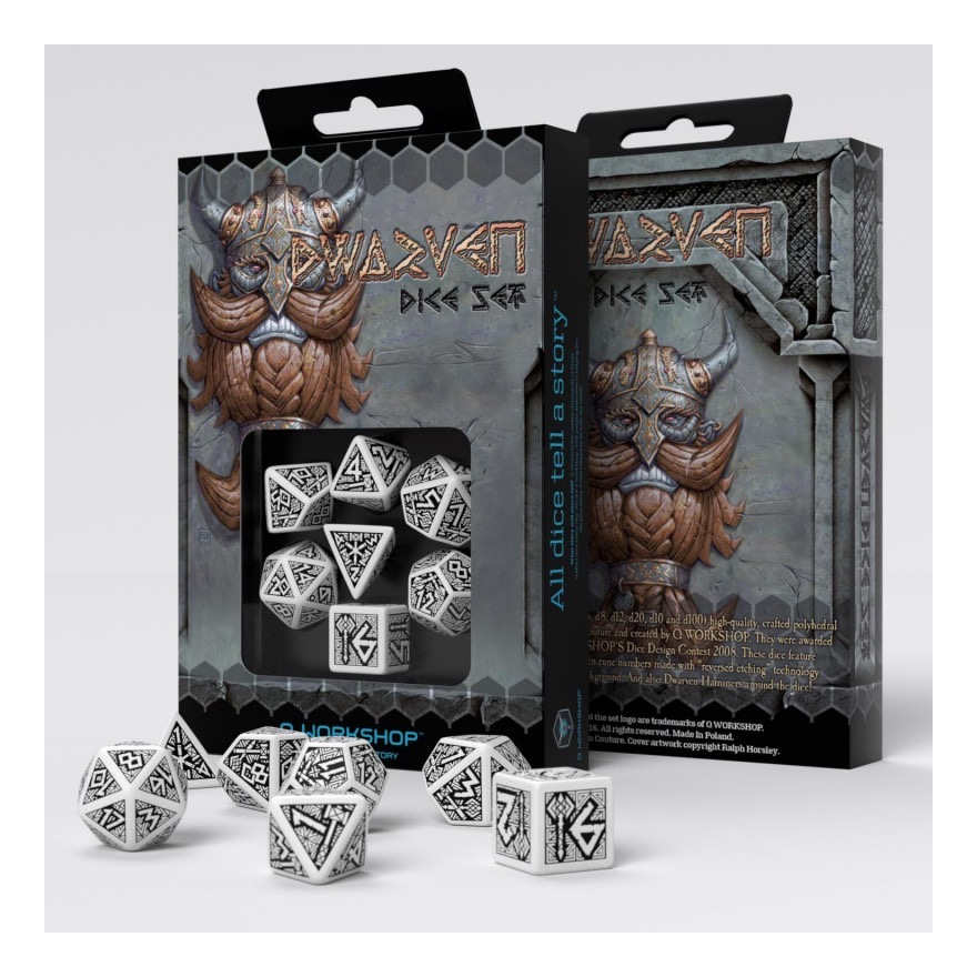 Dwarves are usually associated with undersized, bearded folk who love gold, beer, and juggling hammers. They originally come from the Viking sagas. Thanks to the gods’ will, they were created from the tiny bones of the dead giant – Ymir, while the rest of his skeleton became the building material of the world known to us. They are brothers of the mountains and are really born of the earth’s bones. Our dice are created similarly. We grind the best Nordic giant’s bones in stock and then melt them down to make a resource worthy of dwarves’ craftsmanship. Dwarves are known as the best blacksmiths and jewelers. They also deal with the magic of items. From their workshops come the greatest treasures and the best weapons in the whole known world of the North. They were the ones who forged the weapons of the gods., so our dice can’t be ordinary. They must be perfected all the time, just as the dwarves always look for the perfect forms enchanted in metal and stone. This set must be as strong as the bearded people and beautiful in their usefulness as a perfect product of the dwarven craft. We decided on an extensive engraving, where the numbers and symbols of weapons are more strongly marked, and the delicate “maze” of the lines creates a background. That’s how we got dice worthy of dvergar and their creations.
