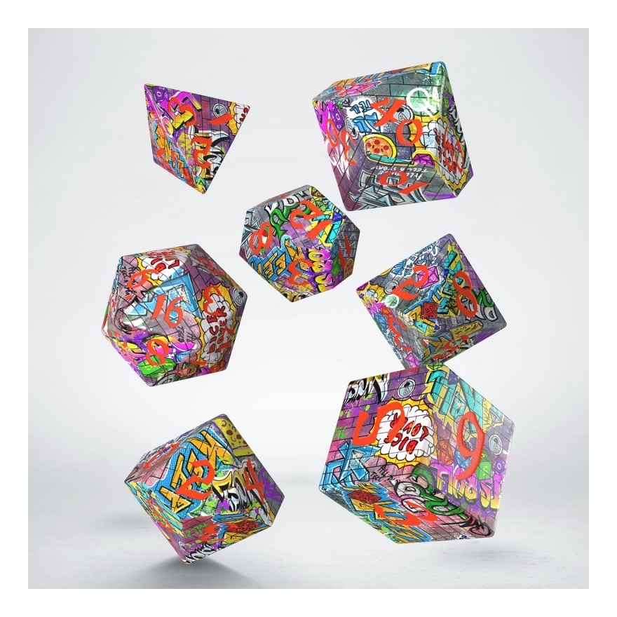 The city breathes in color, and its buildings are a canvass for new kind of artists. These dice capture that raw pulse — a snapshot of urban rebellion frozen in motion. A subtle brickwork pattern serves as the backdrop, like a wall waiting to be claimed. Across it, graffiti sprawls in wild vibrancy: tags, shapes, figures and bursts of pigment flow seamlessly across edges. The digits, painted in bold red, pop like fresh spray on concrete — sharp, loud, eye-catching.