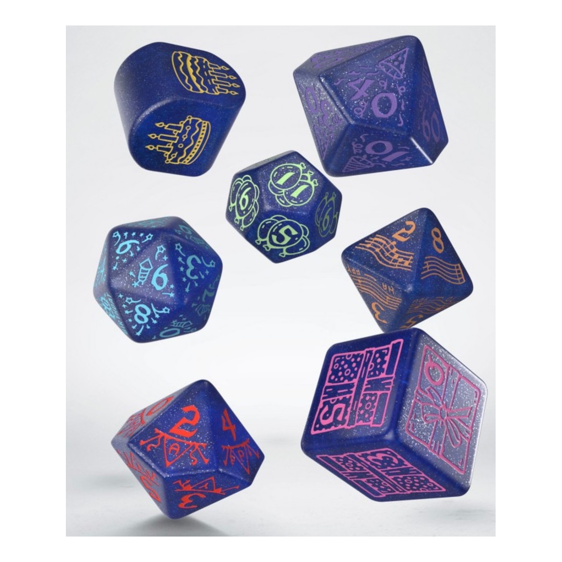 – Festive colors – The material is shimmering-blue (mixed with glitter dust), and each painting on each dice is in a different pastel color.