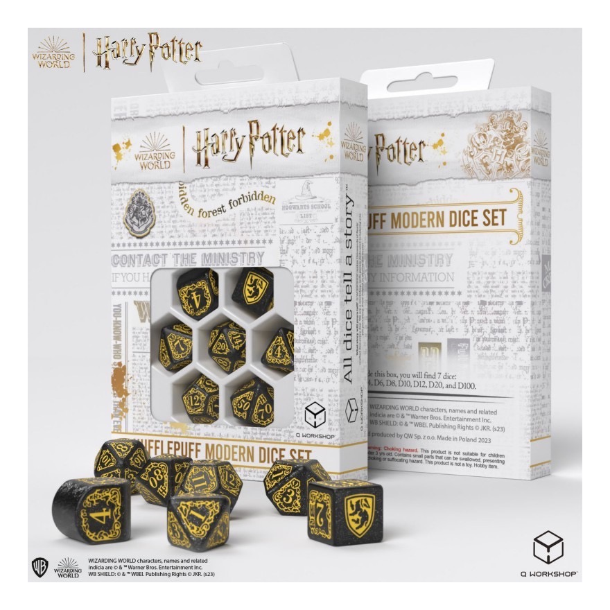 Experience the magic of the Wizarding World with Q WORKSHOP, proudly presenting a Modern Dice Set dedicated to Hufflepuff. The design is filled with symbols and details referring to the house known for the loyalty of its members. The material of the dice is mixed with glitter dust, making it shimmer and causing the yellow and black colors even more appealing.