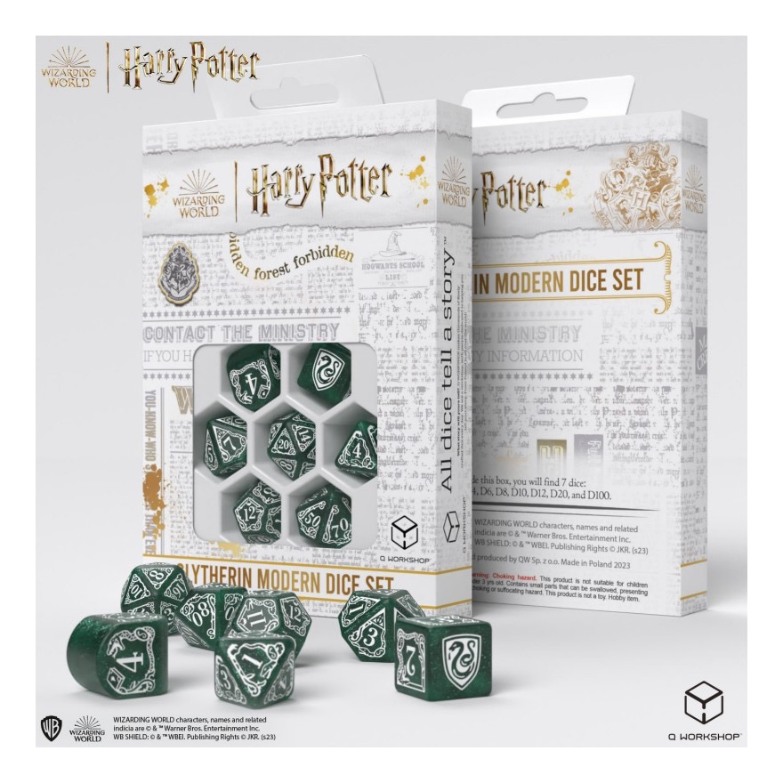 Experience the magic of the Wizarding World with Q WORKSHOP, proudly presenting a Modern Dice Set dedicated to Slytherin. The design is filled with symbols and details referring to the house known for the ambition of its members. The material of the dice is mixed with glitter dust, making it shimmer and causing the green and white colors even more appealing.