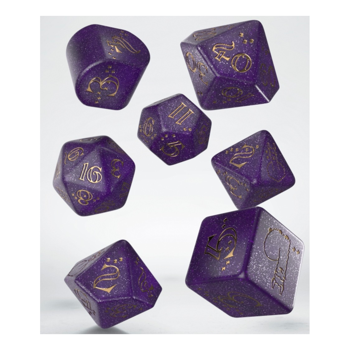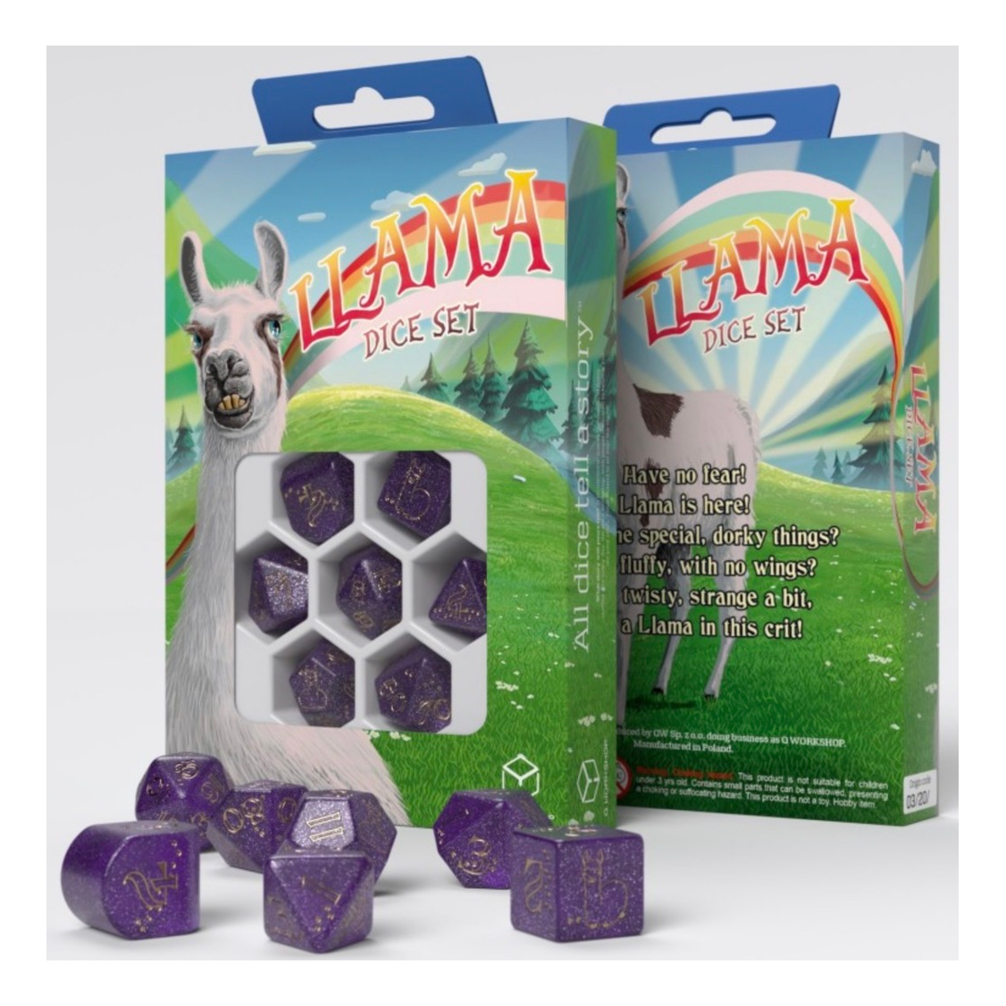 For Quick Thinkers and Fast Rollers! Llama Dice Set: Zippy is a dazzling collection of 7 polyhedral dice in Shimmering-purple material with golden engravings. Each highest face features the ever-elusive Zippy in different poses—proud, leaping, or scheming! With unique hooves markings and top-tier craftsmanship from Q WORKSHOP, this set is a must-have for every llama-loving adventurer.