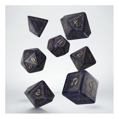 Q WORKSHOP Runic Dice are back! A classic design in which the mixed shades of blue evoke the appearance of sodalite – a stone considered a source of clear thoughts, intuition and creativity. The classic, timeless runic pattern ensures unique style and perfect readability. This 7-piece set is a fusion of magic, precision, and top-tier craftsmanship.