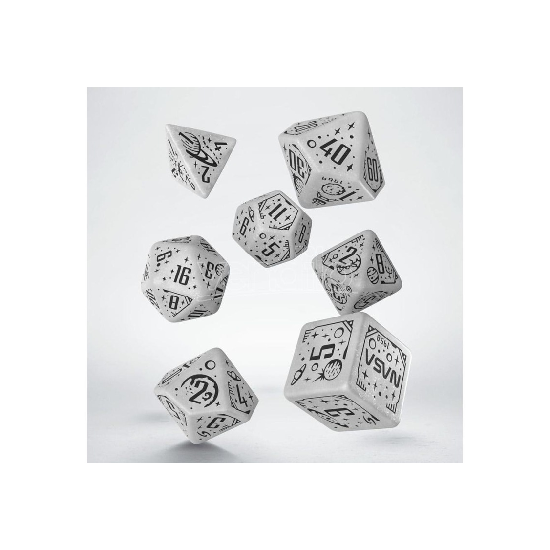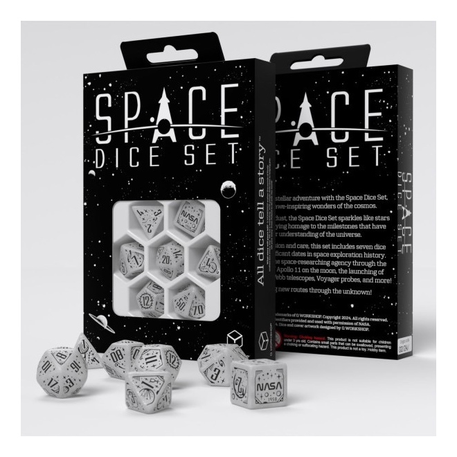 Space Dice Set Apollo RPG Dice Set Inspired by NASA Apollo – Shimmering White with Black Engravings – Perfect for Tabletop Games & RPGs – 7 Polyhedral Dice (D4, D6, D8, 2D10, D12, D20