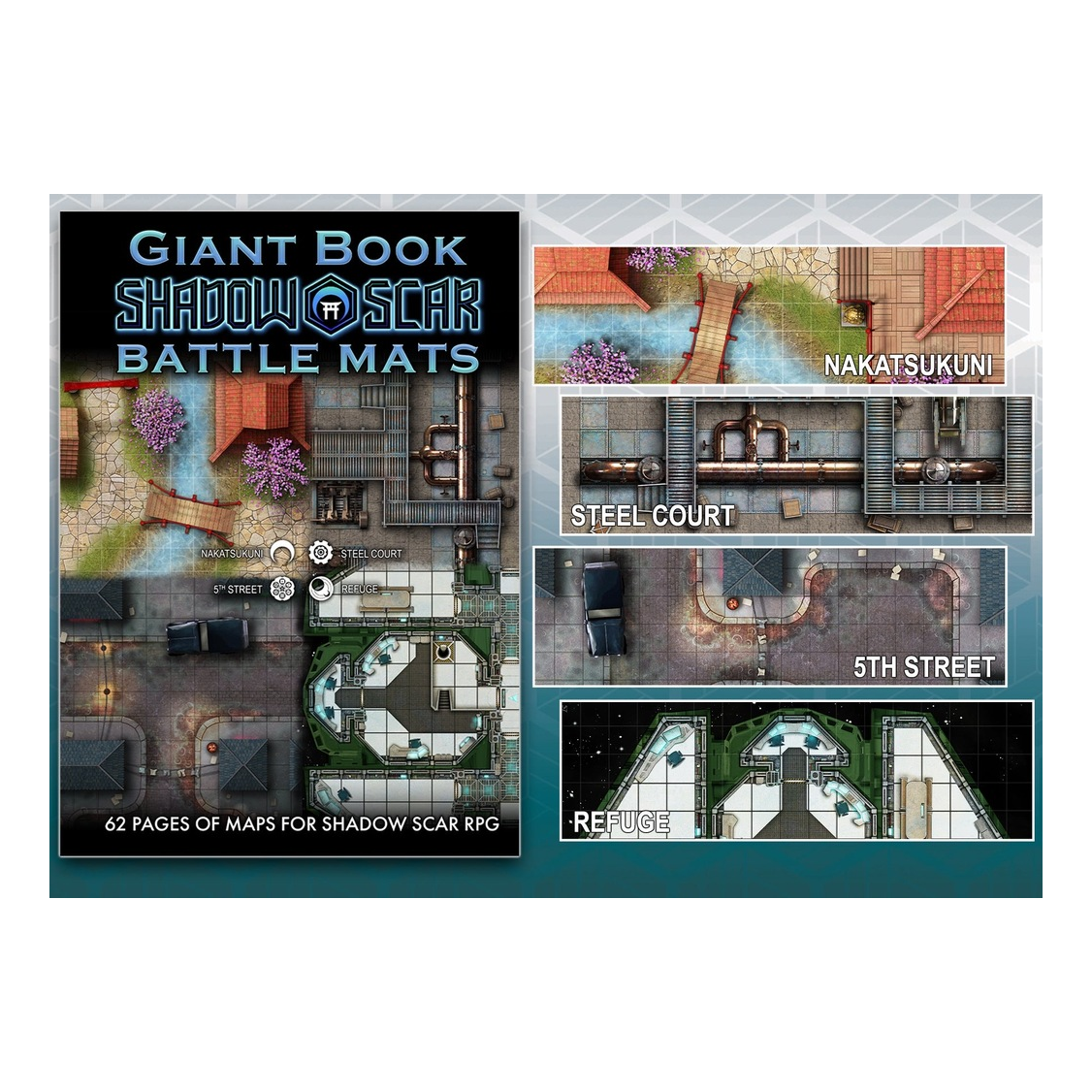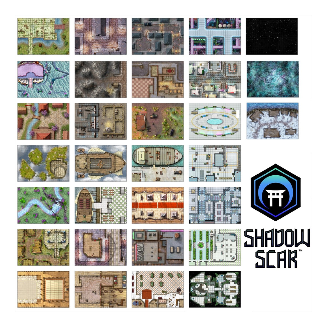 – 62 battle map pages tailored for the Shadow Scar RPG setting featuring Refuge, 5th Street, Steel Court and Nakatsukuni.