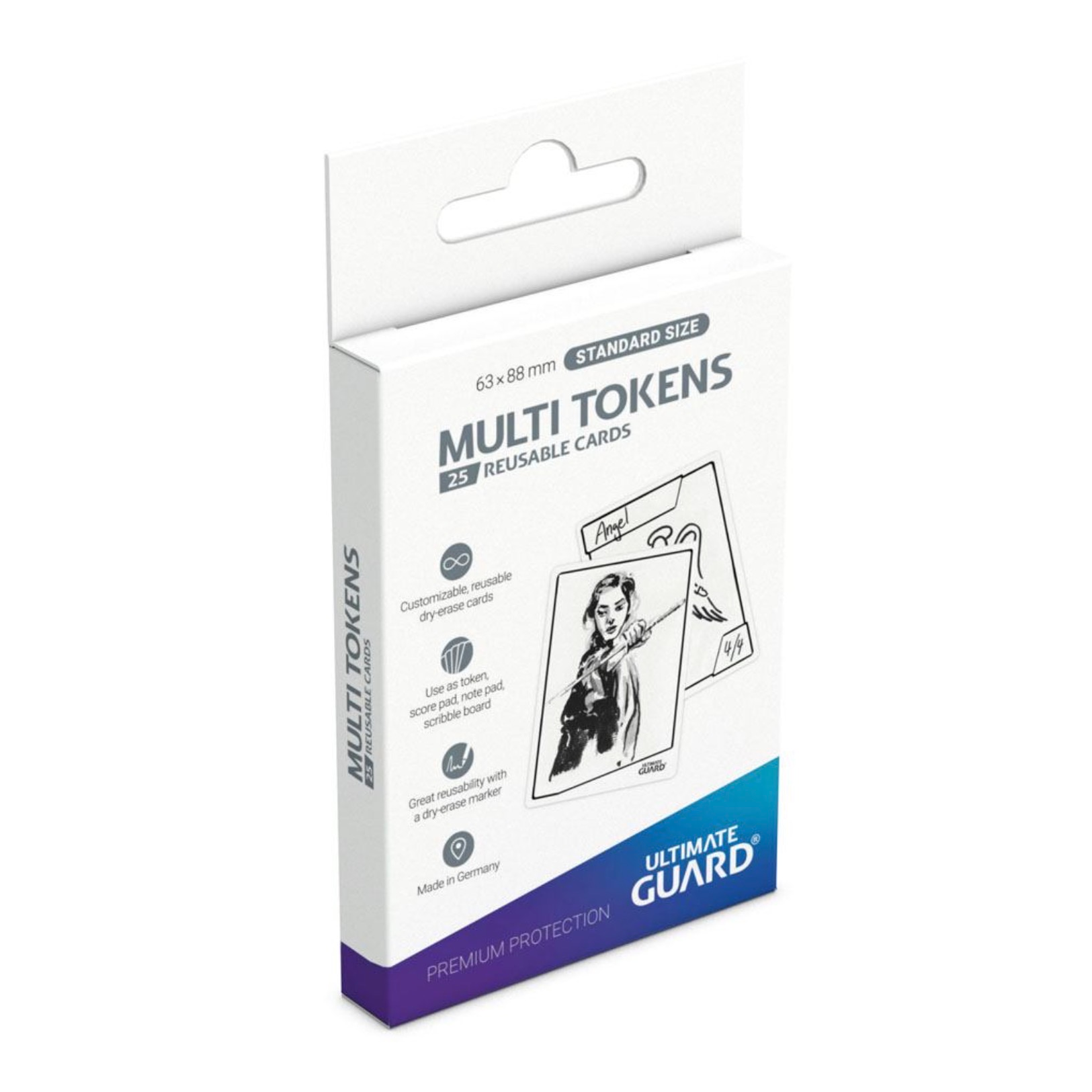 Customizable and reusable in combination with dry-erase markers, these standard sized tokens are made of high-quality playing card board for long-lasting durability and multiple uses. Scribble, draw, count and erase with our Ultimate Guard Multi Tokens.